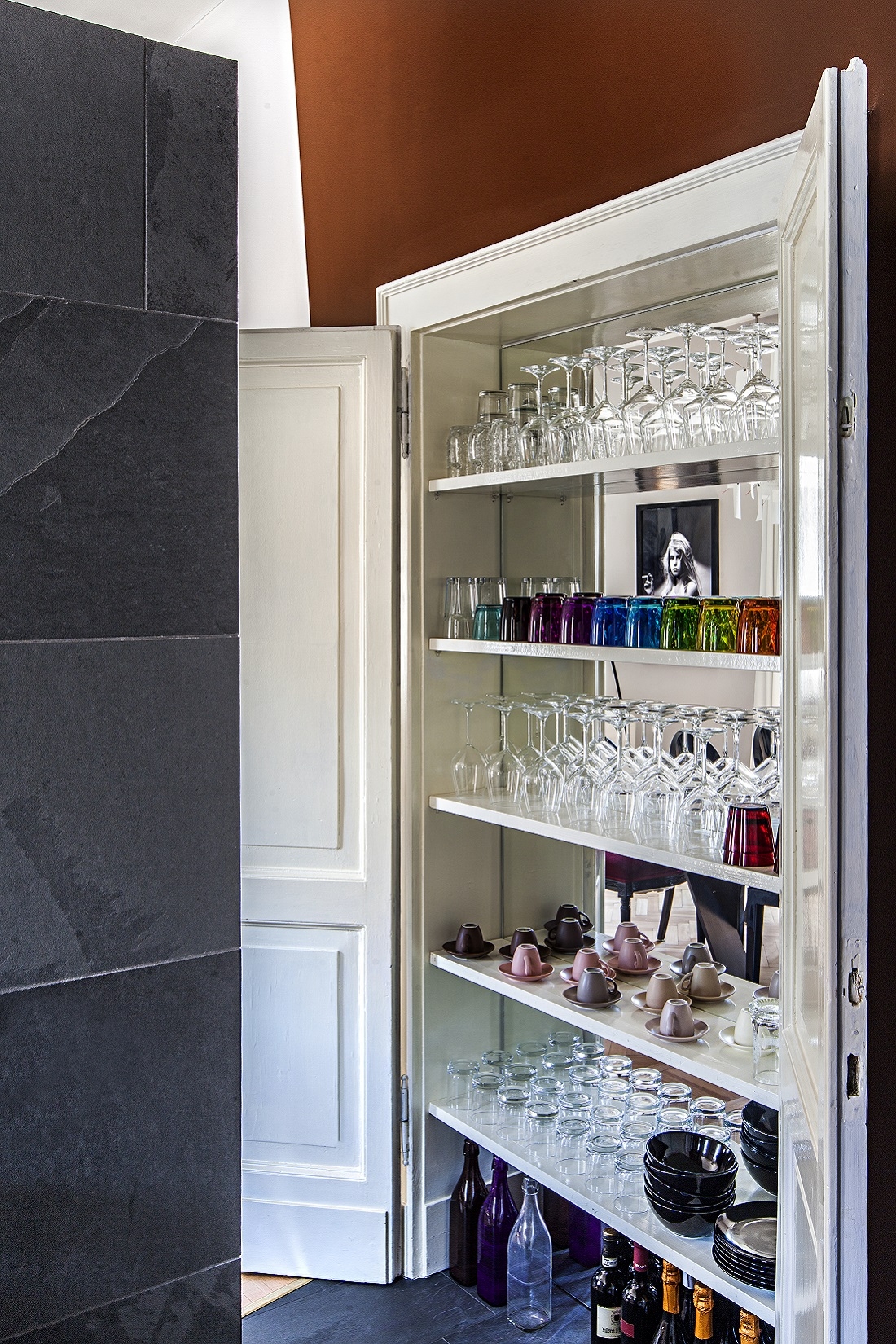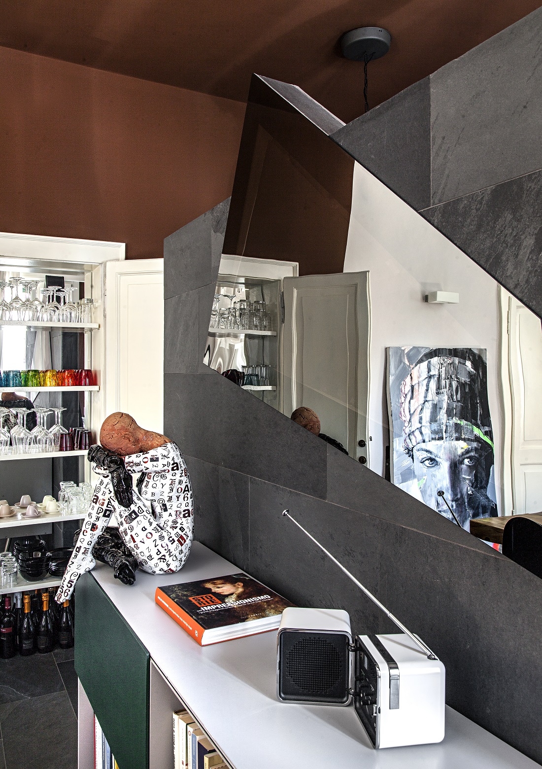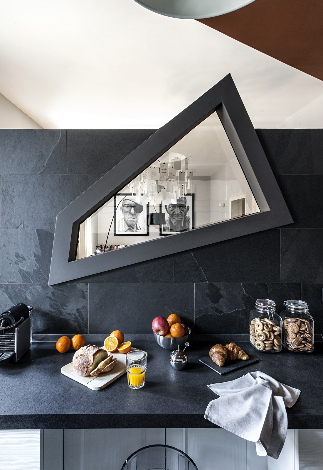La parete in ardesia ,con lo specchio “spia”, separa il soggiorno dalla cucina.