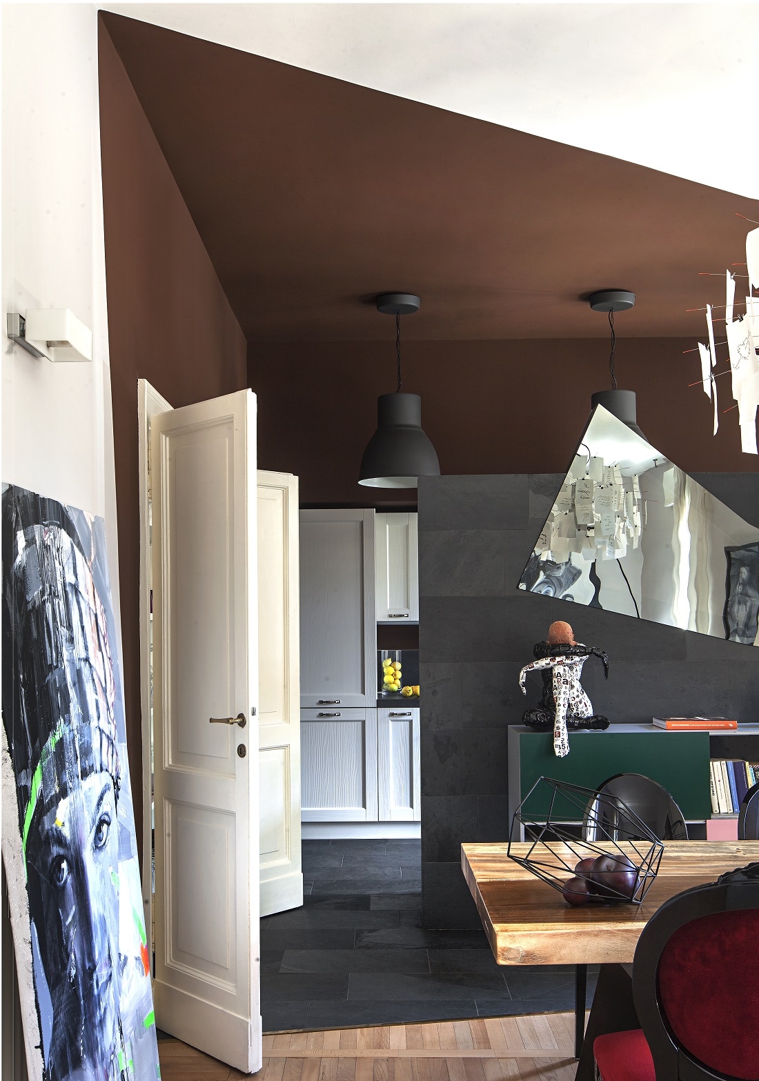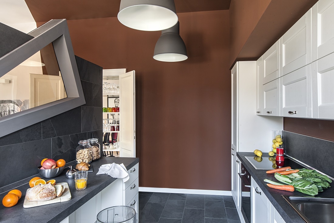 Il colore scuro delle pareti e del soffitto della cucina, mirano ad ottenere l’effetto di una stanza all’interno di un’altra stanza.