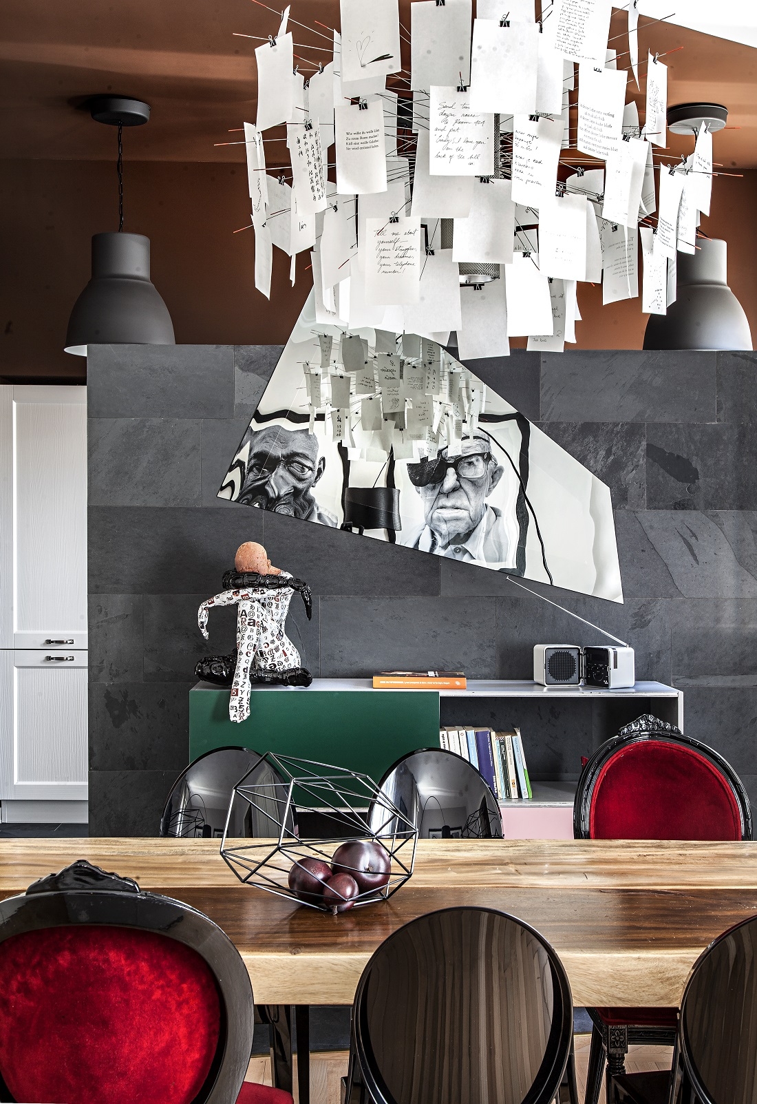 Sopra al tavolo da pranzo lampada Zettel'z disegnata da Ingo Maurer.