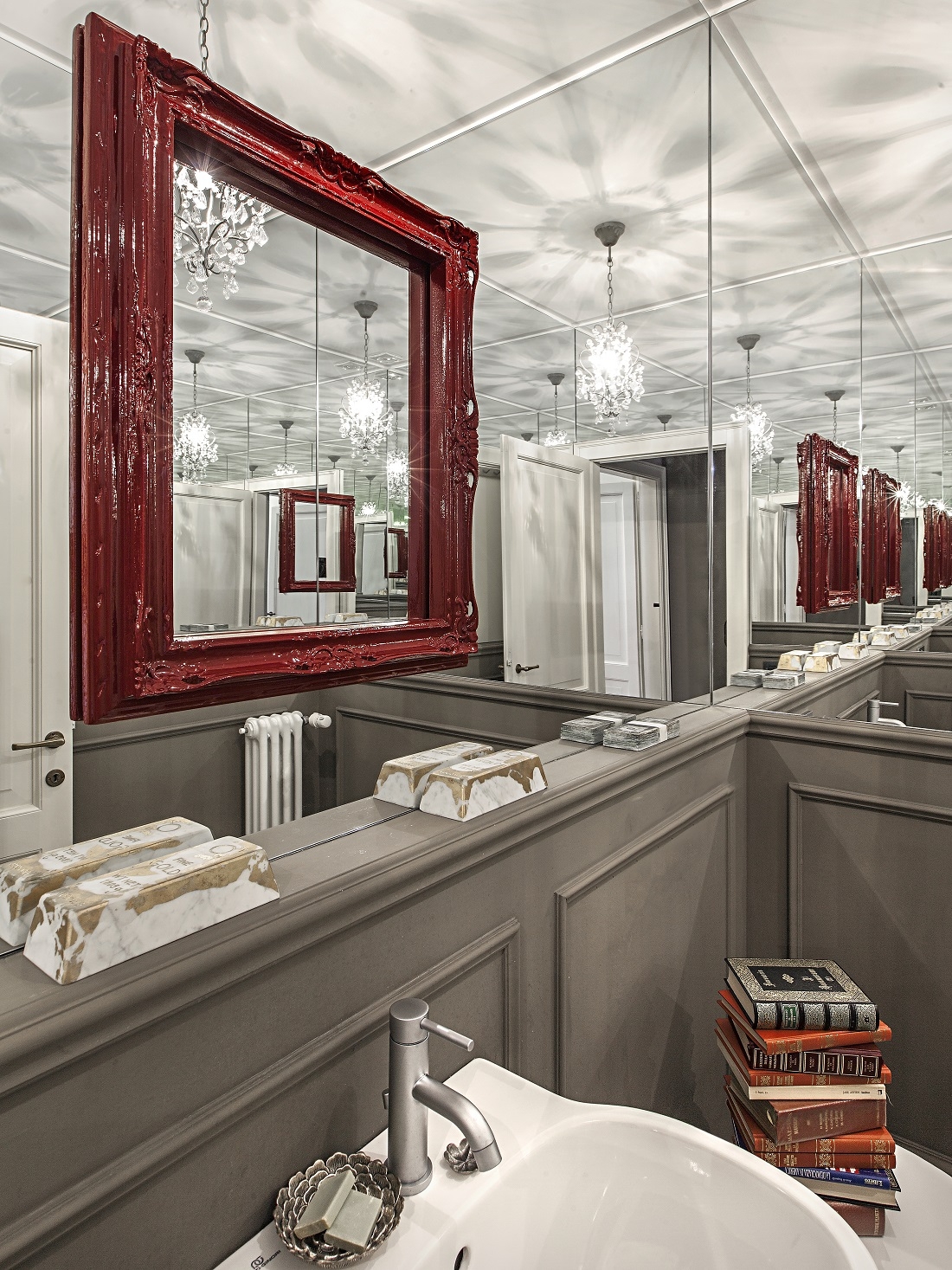 Il bagno si trasforma in una scatola di specchi; sopra al piano lingotti di Nazareno Biondo.