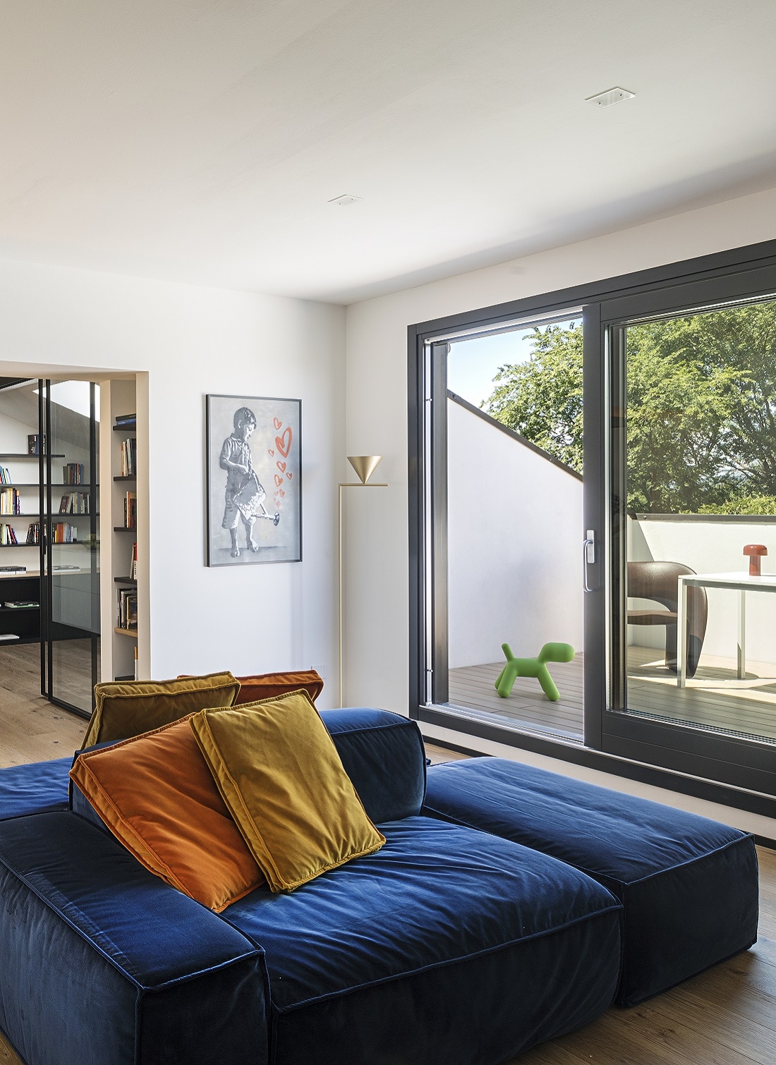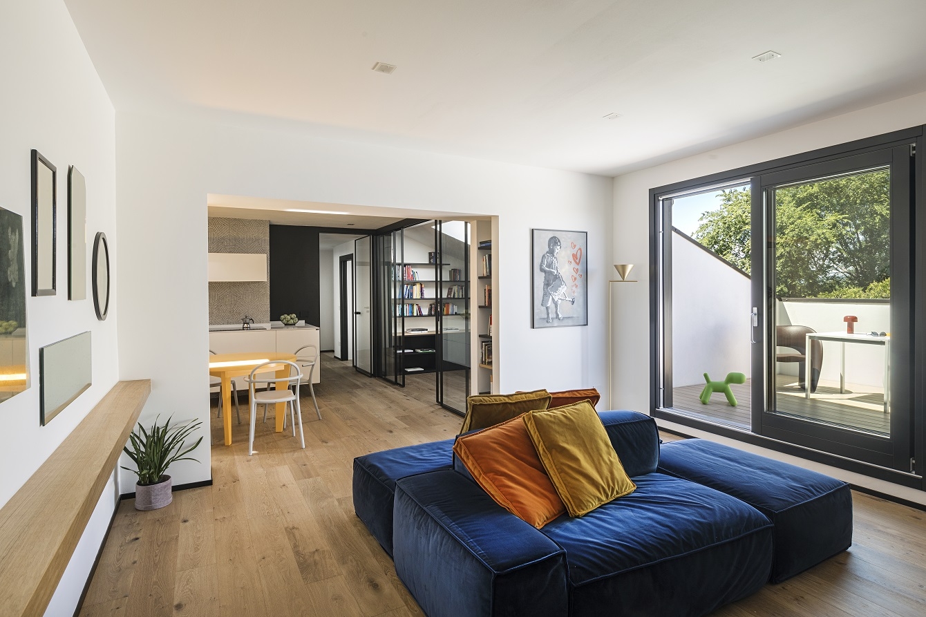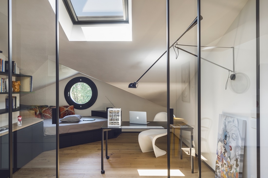 Una vetrata scorrevole separa con leggerezza l’area dedicata allo studio che costituisce un unicum spaziale con il resto della zona giorno e un ulteriore spazio relax.