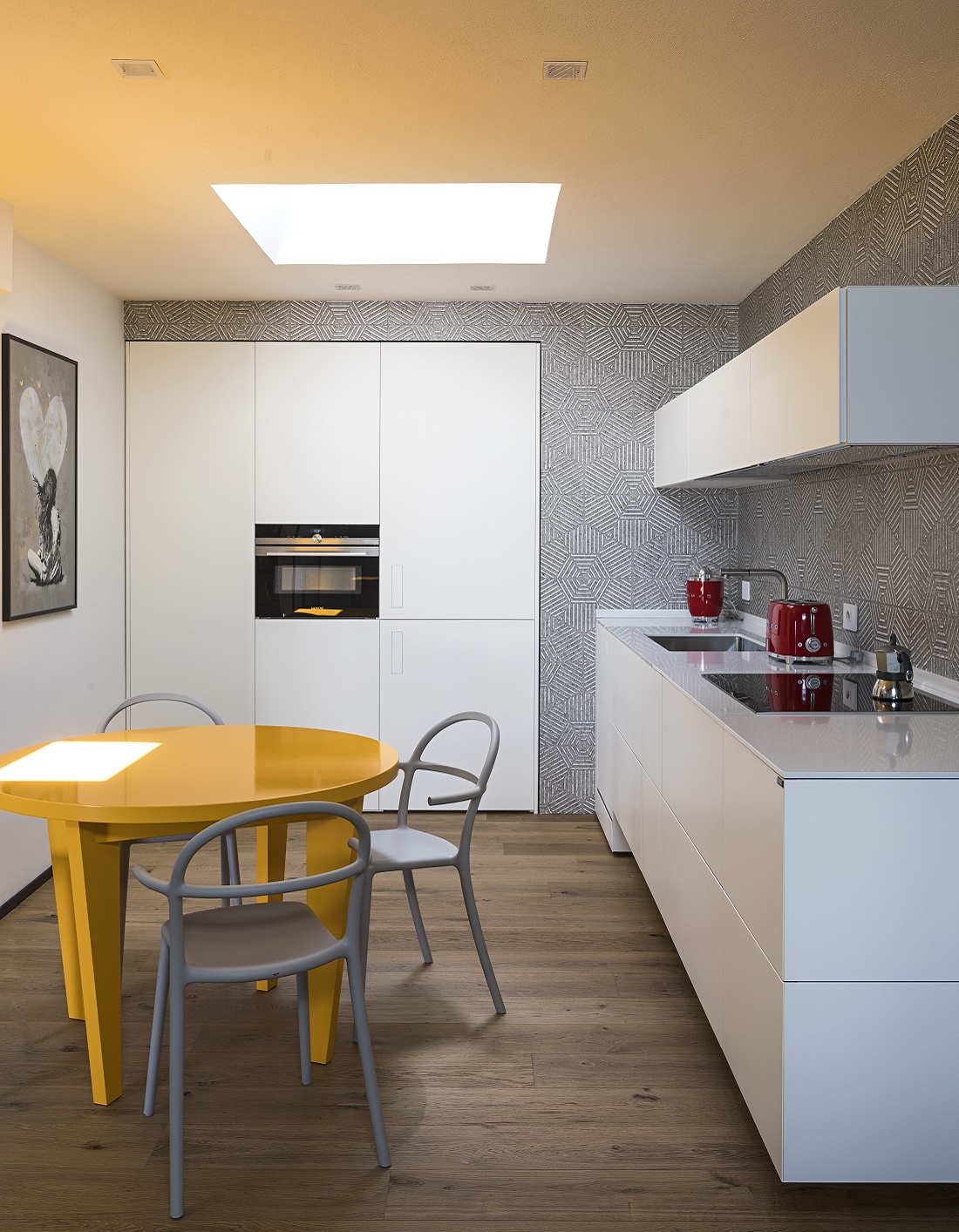 Lo spazio cucina è caratterizzato dal grande lucernario; a soffitto faretti M1 di Viabizzuno.