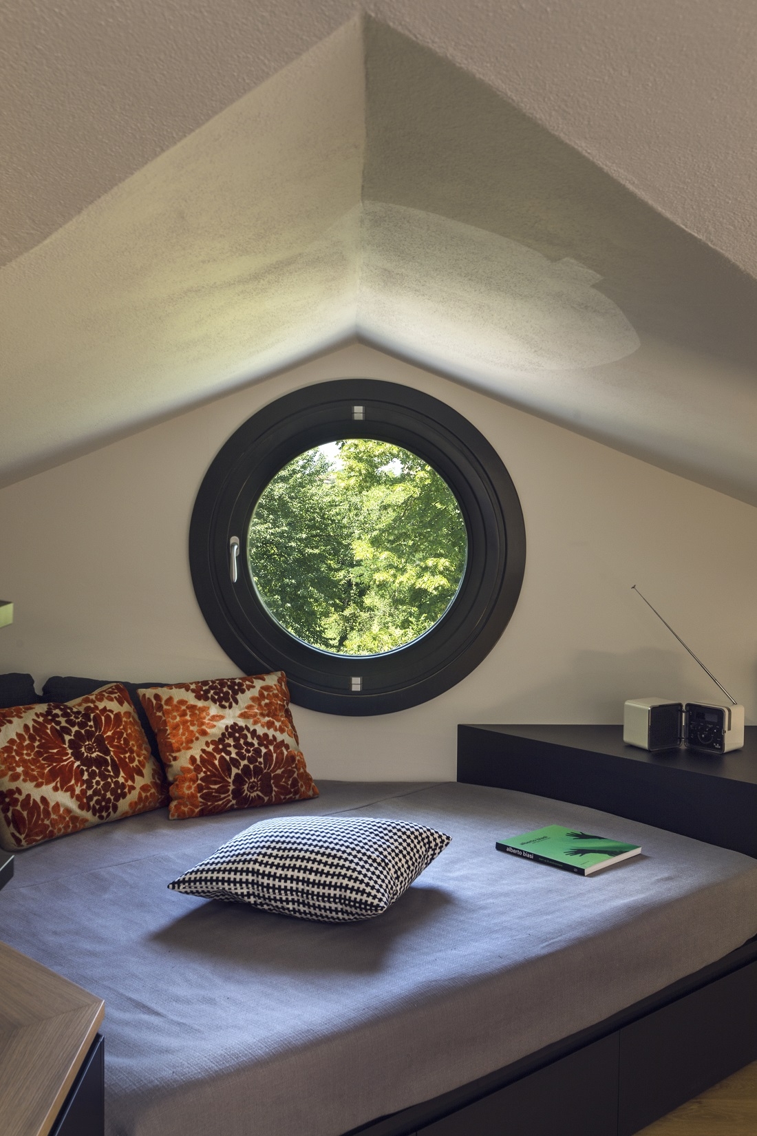 Accanto all’ oblò, che permette la vista sul parco della villa, il divano letto.