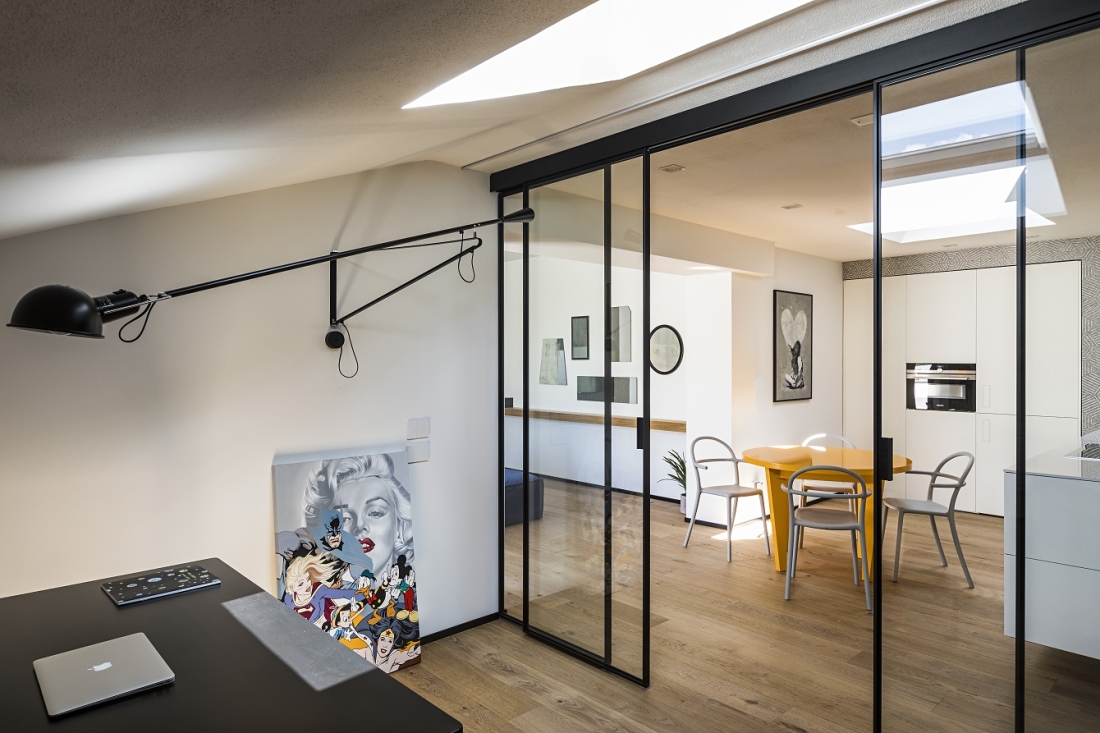 La vetrata scorrevole “Velaria” di Rimadesio, separa con leggerezza l’area dedicata allo studio.