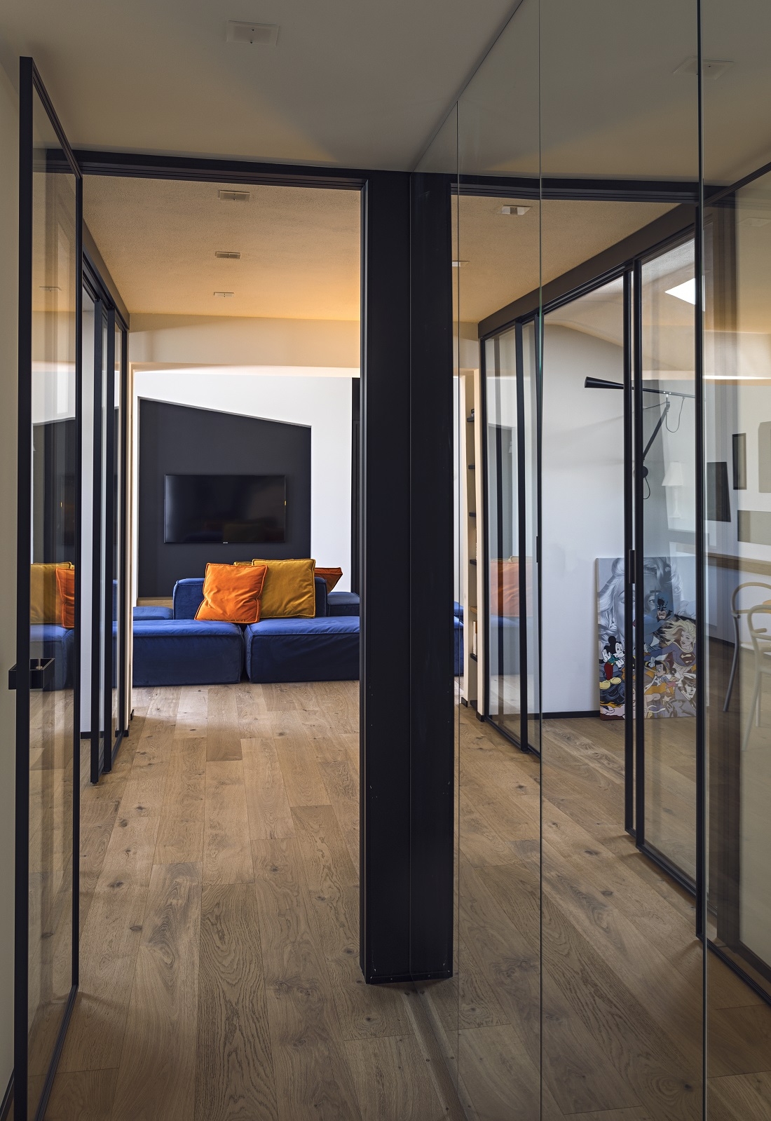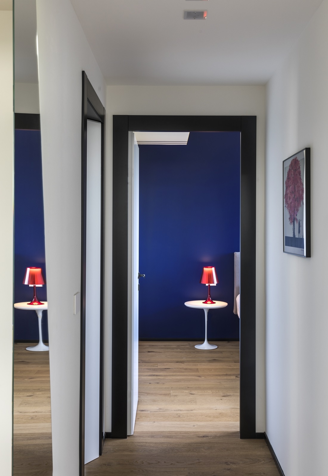 Corridoio zona notte con battiscopa e cornice porte color nero.