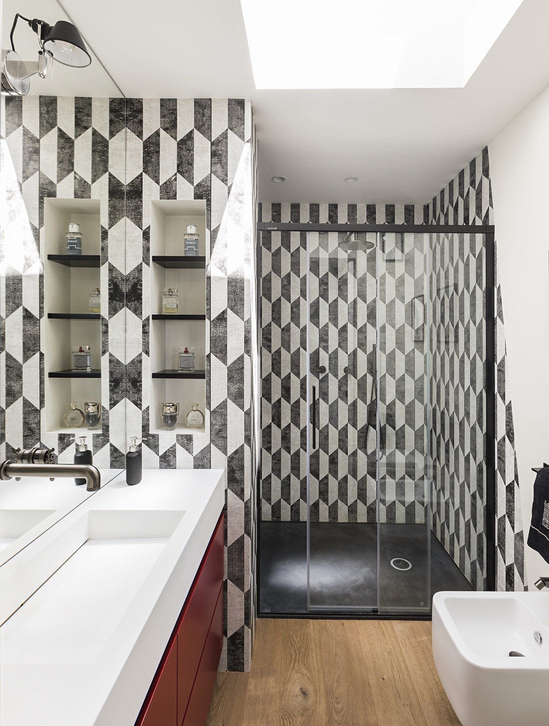 Bagno caratterizzato dal rivestimento in fibra di vetro di London Art effetto optical.