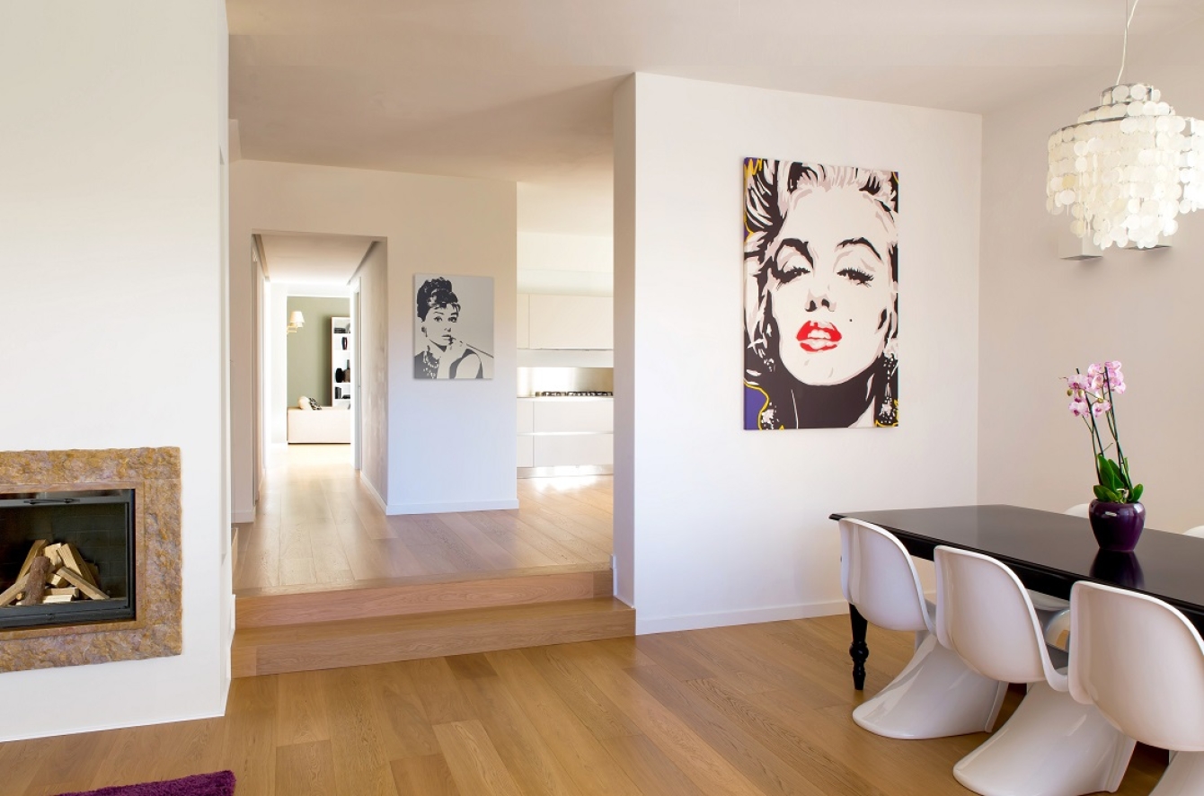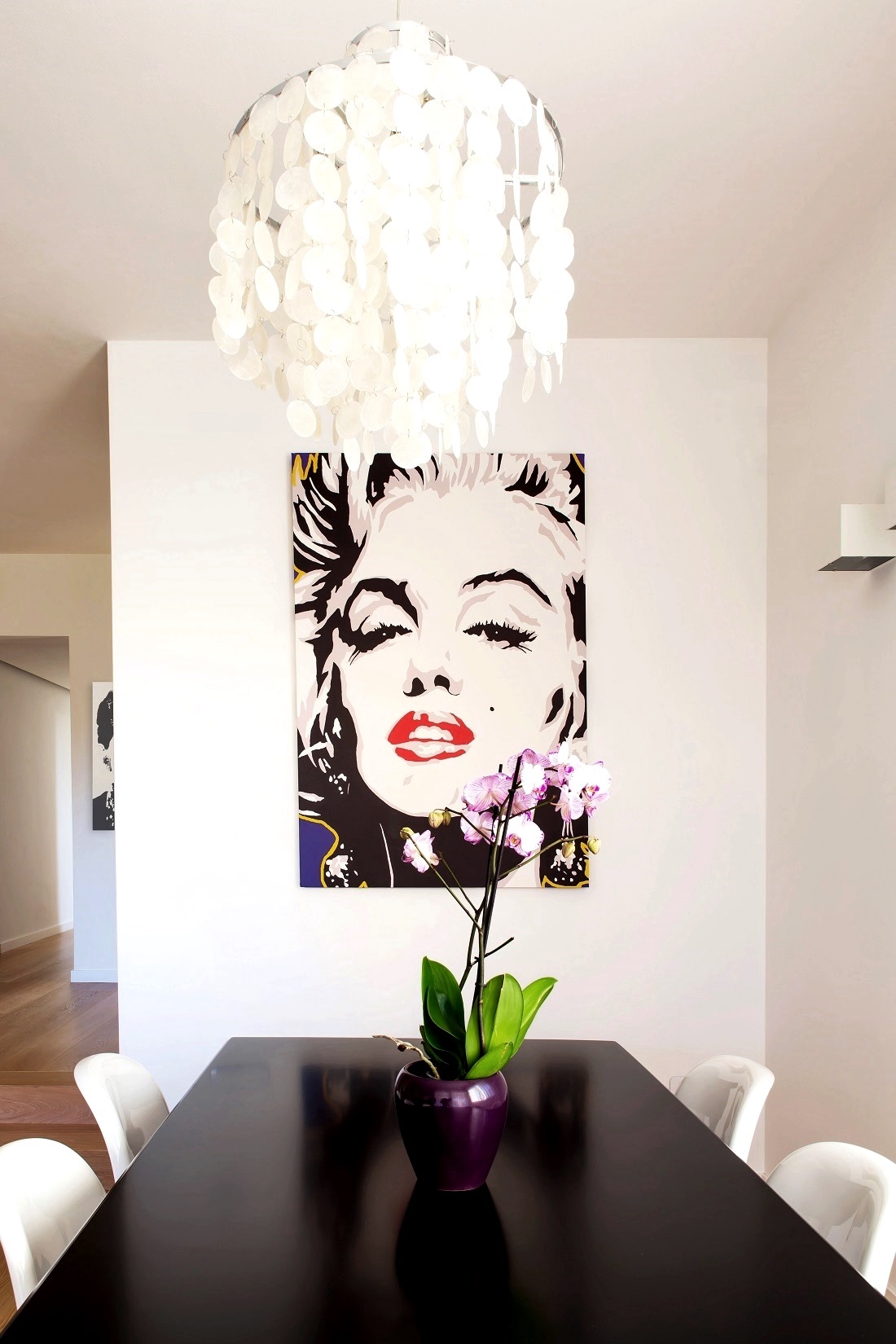 Lampadario in madreperla di Verner Panton, a parete opera rappresentante Merilyn Monroe.