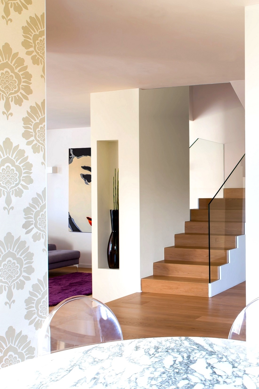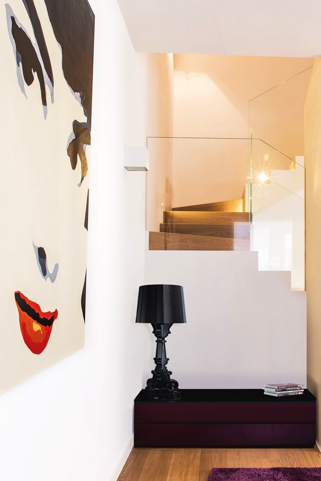 La scala con il parapetto in vetro che affaccia sul soggiorno. Lampada Bourgie di Kartell.