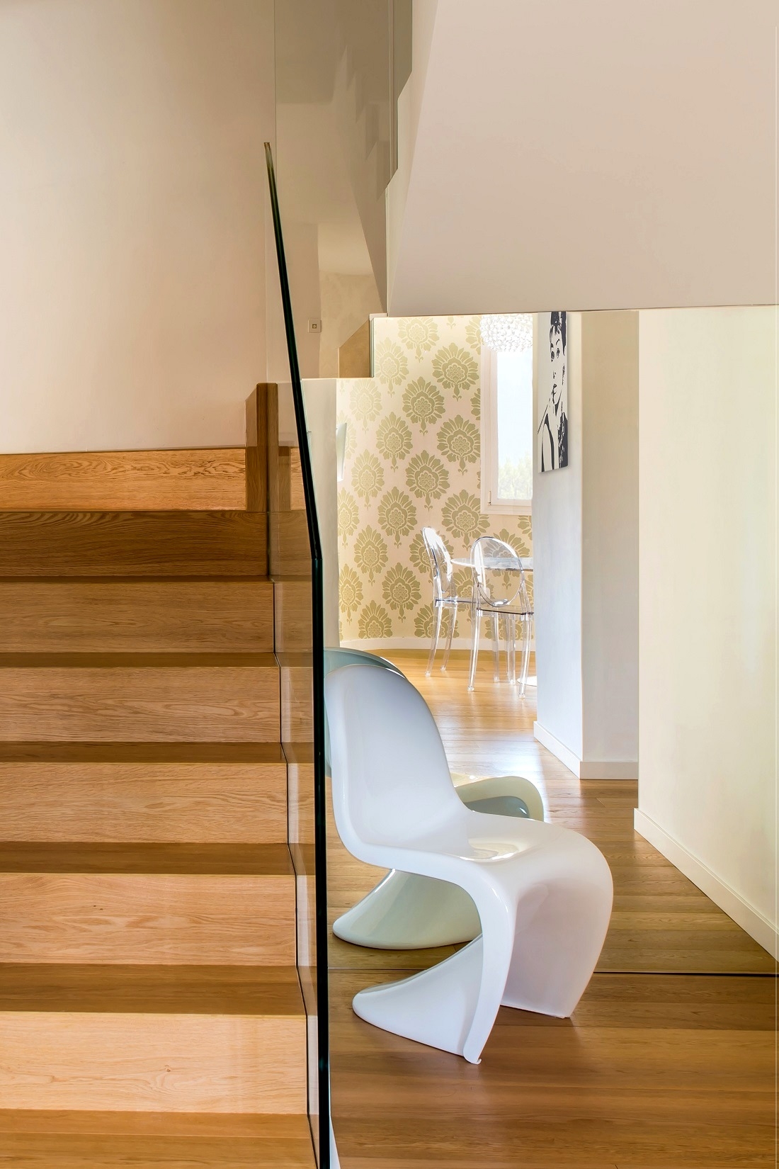 Nella zona ingresso, specchio a tutt’altezza e sedia Panton di Vitra.