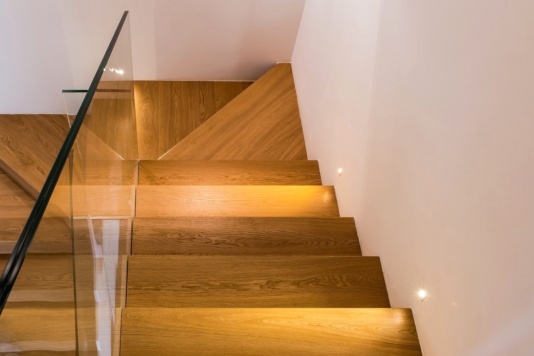 Dettaglio della scala in legno con parapetto in vetro stratificato.
