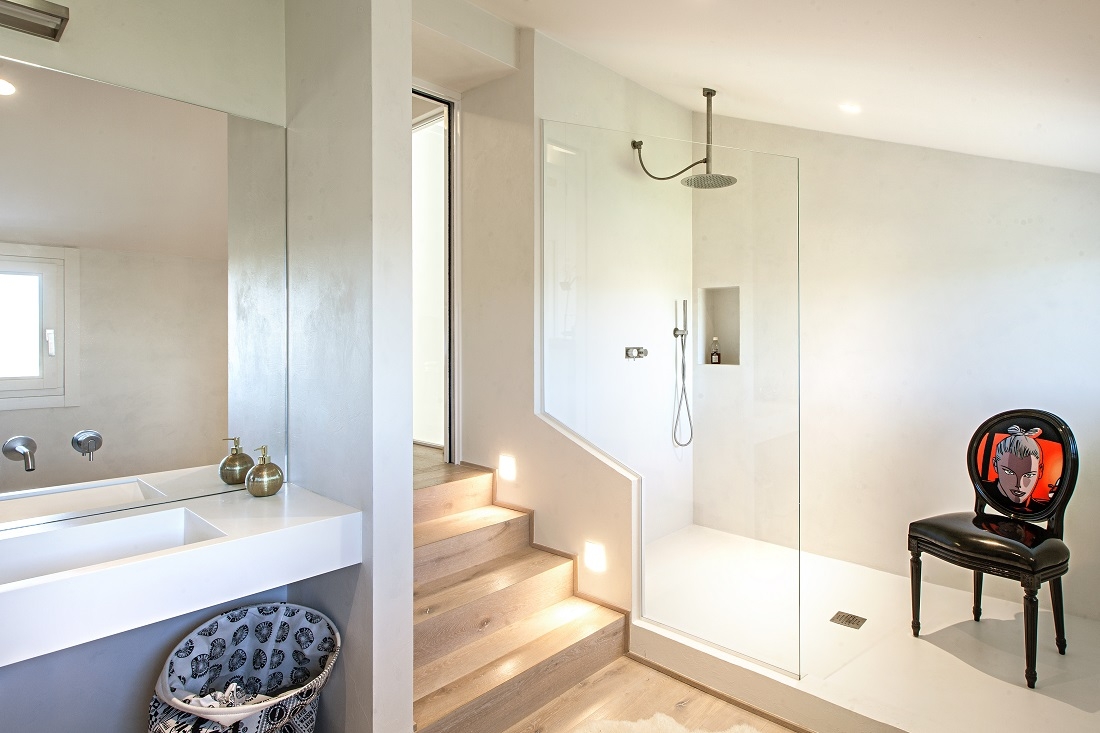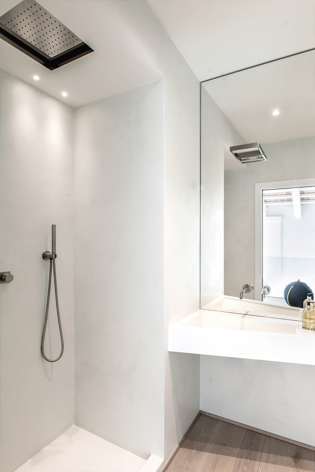 In bagno pareti rivestite in resina bianca, rubinetteria in acciaio satinato Antonio Lupi.