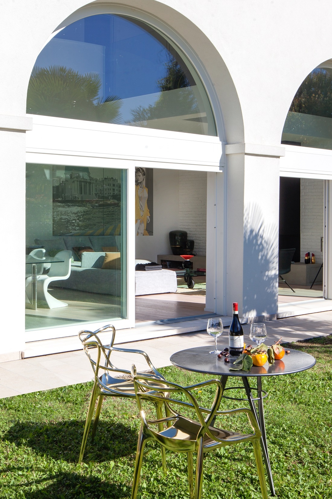 In primo piano sedie dorate Masters di Kartell sullo sfondo le vecchie aperture ad arco ristrutturate.