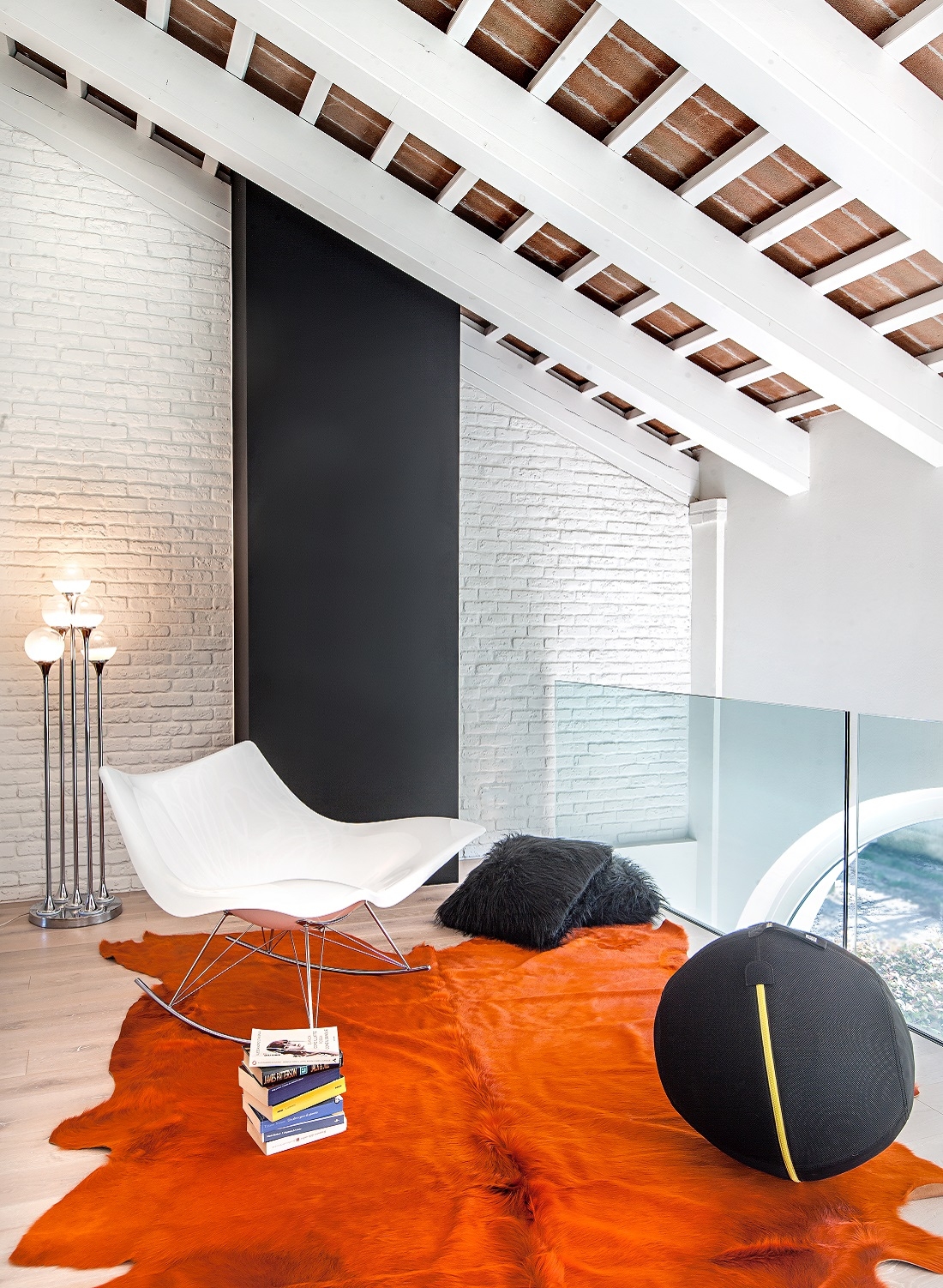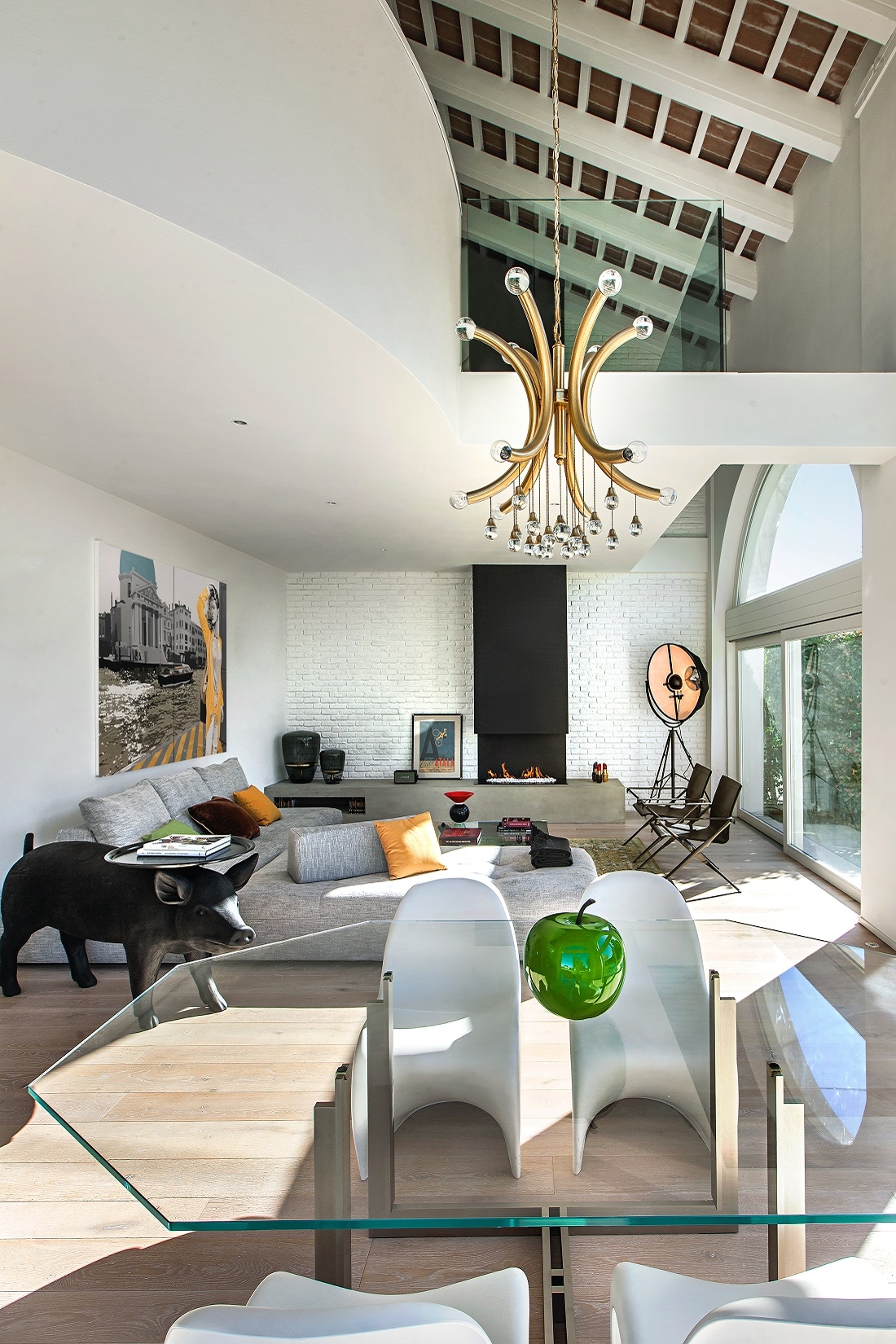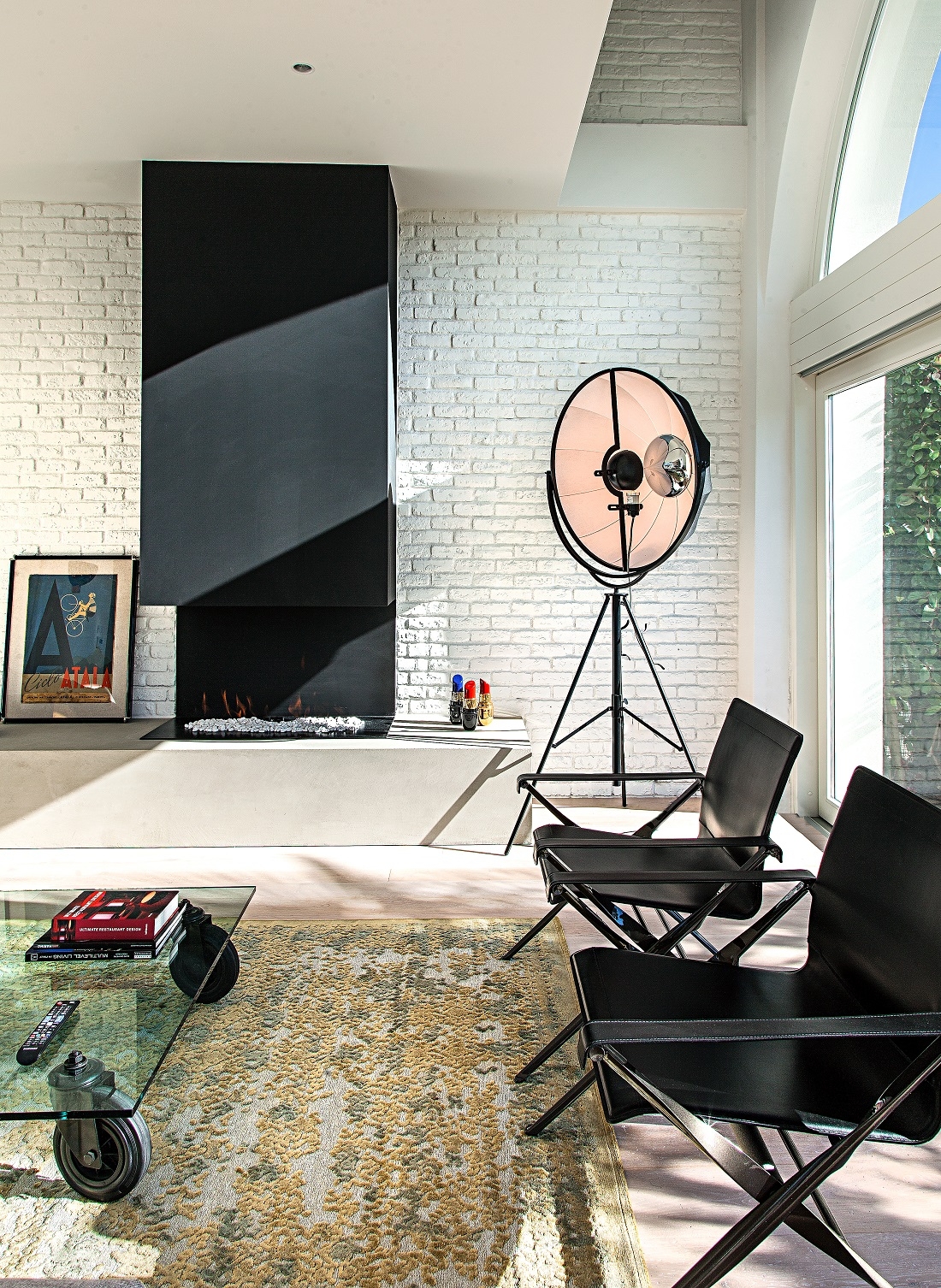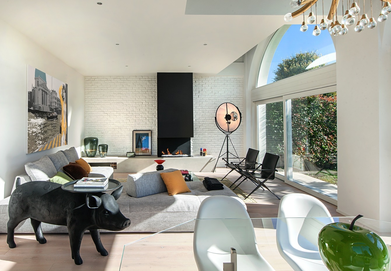 Nel soggiorno a doppia altezza, la canna fumaria del camino attraversa il soppalco fino al tetto.