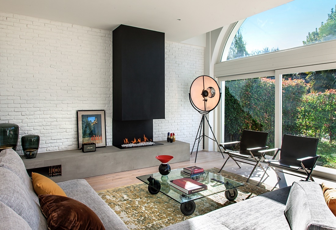La parete in mattoni a vista fa da sfondo al camino nero realizzato su disegno.