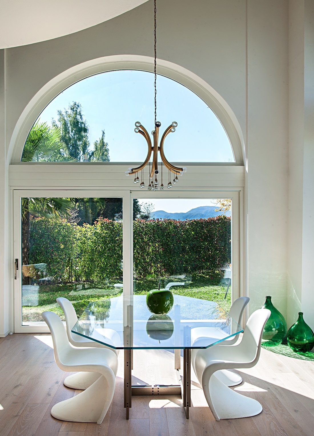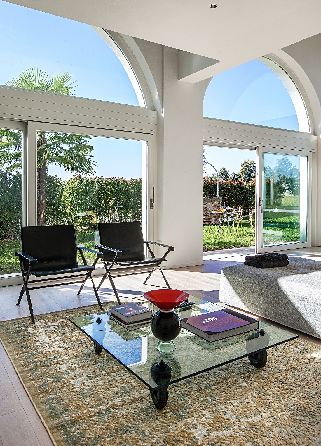 Attraverso la grande vetrata si intravede il soggiorno a doppia altezza.
