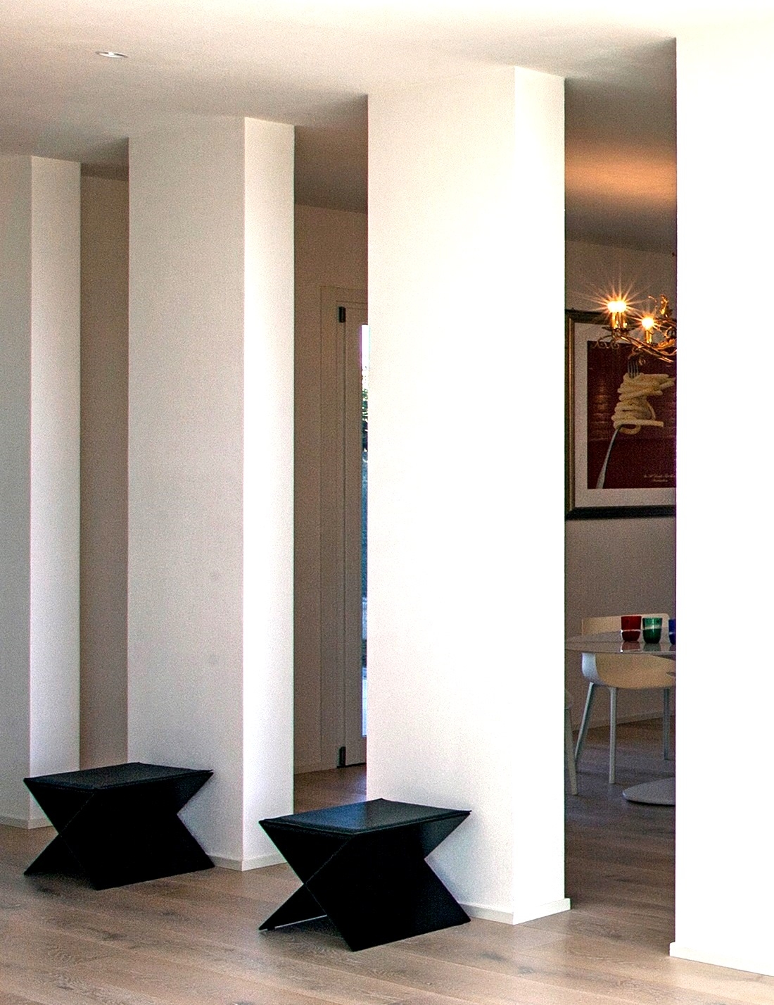 Setti a tutta altezza filtrano il passaggio dal soggiorno alla cucina.