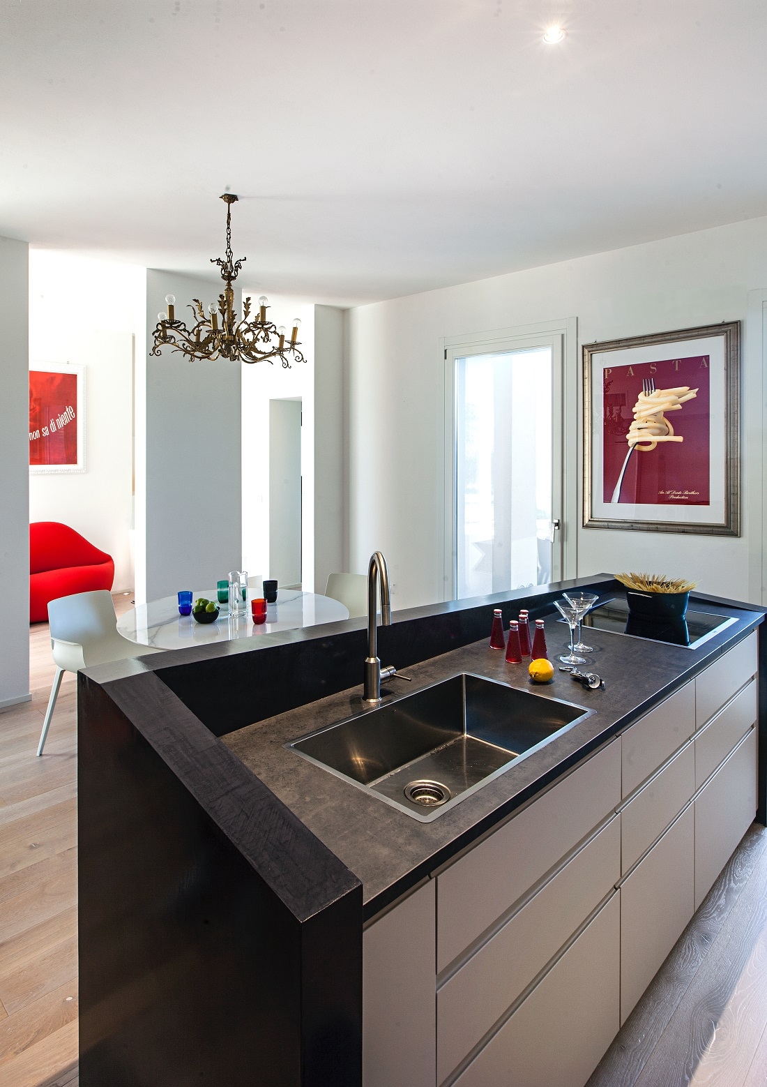 L’elemento a “C” in resina nera contiene la parte operativa della cucina.