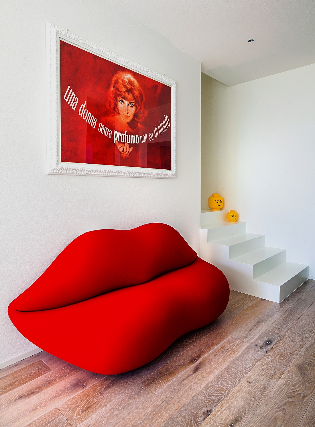 Arredano l'ingresso divano dall'anima pop, Bocca di Gufram, e manifesto degli anni '50.