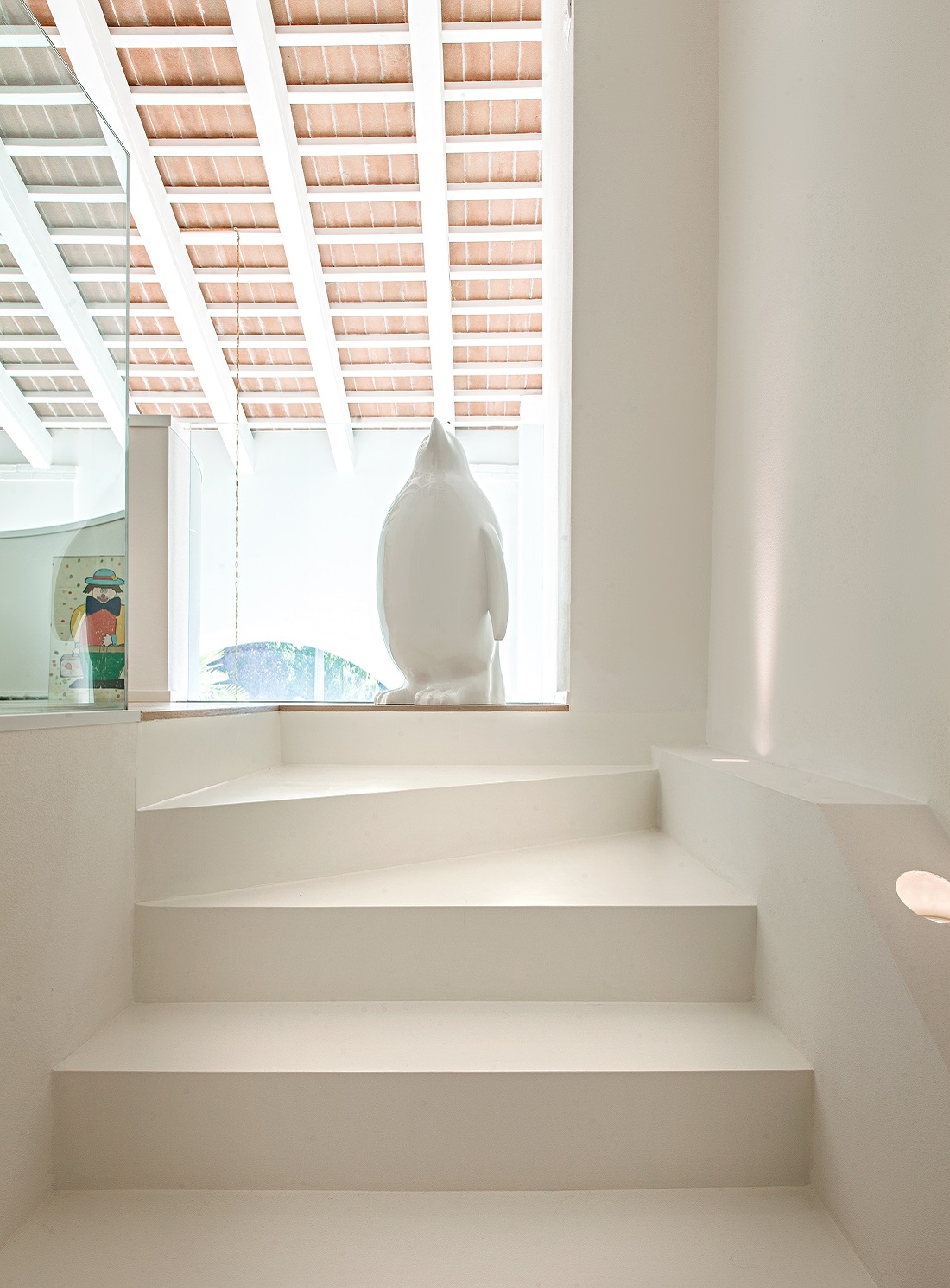La scala in resina bianca conduce al soppalco; faretti Viabizzuno incassati a pavimento.