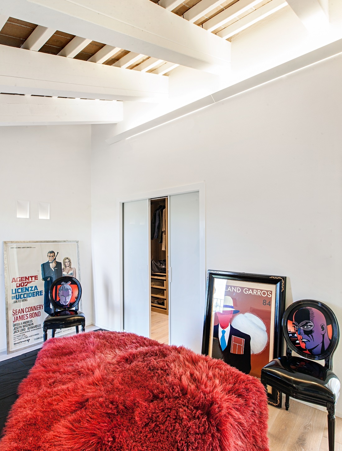 Dal soggiorno, attraverso una scala in resina bianca, si accede alla zona notte, riservata a due camere da letto e due bagni.