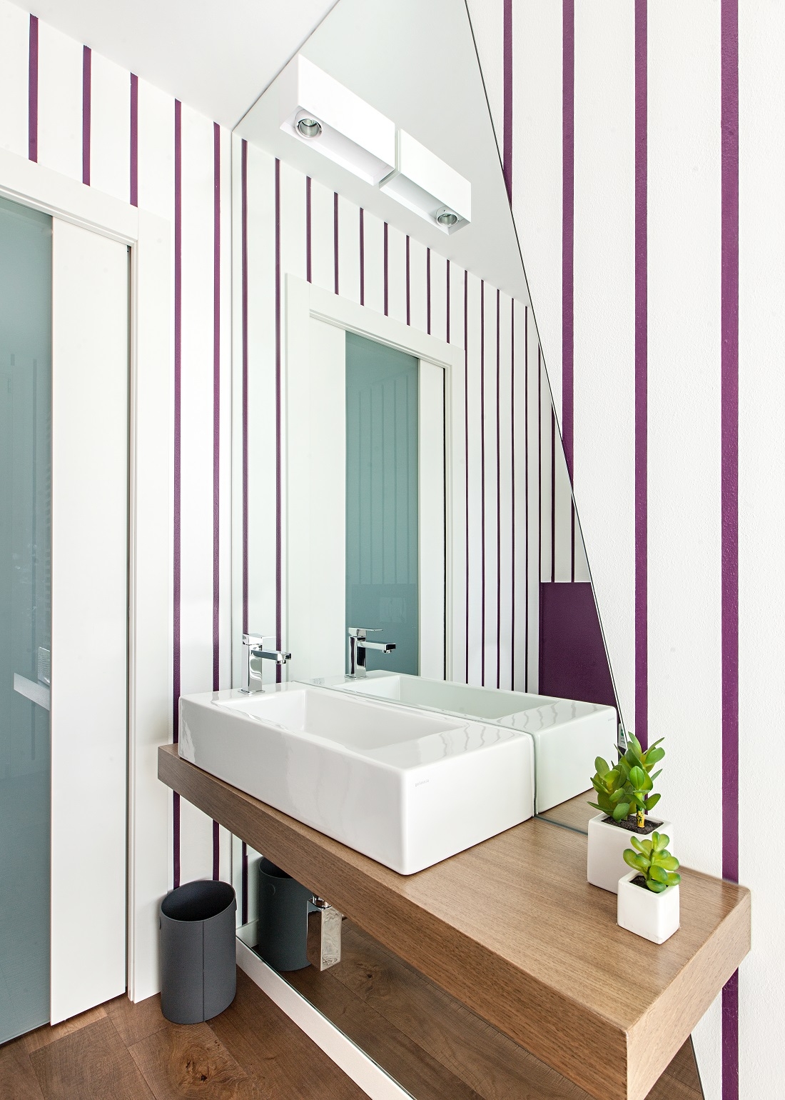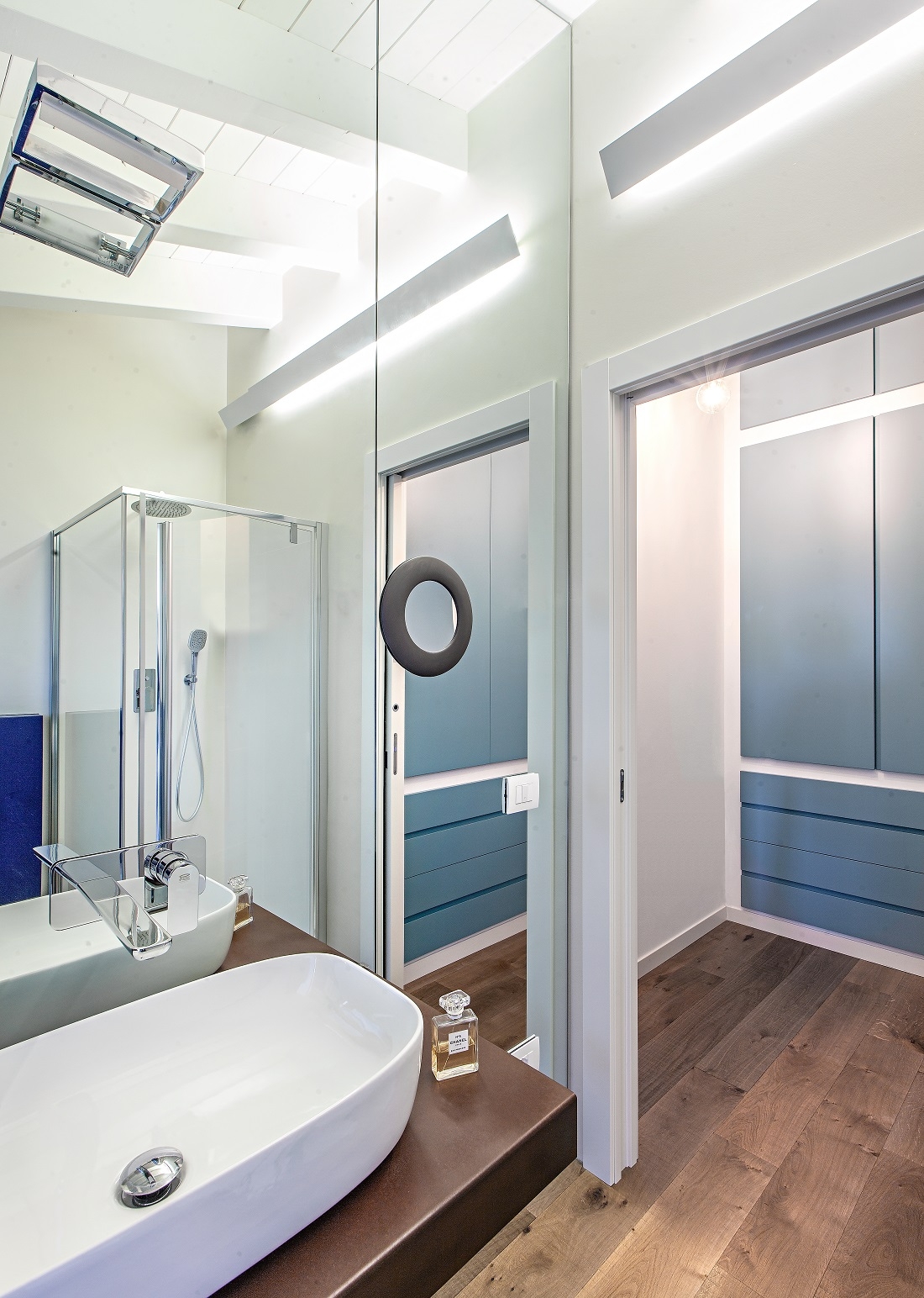 Eleganti linee sottili decorano le pareti del bagno, uno specchio a tutta altezza amplia lo spazio.