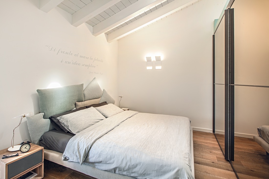 Nella camera padronale letto Picabia di Bonaldo; a parete lampade Vela di Viabizzuno.