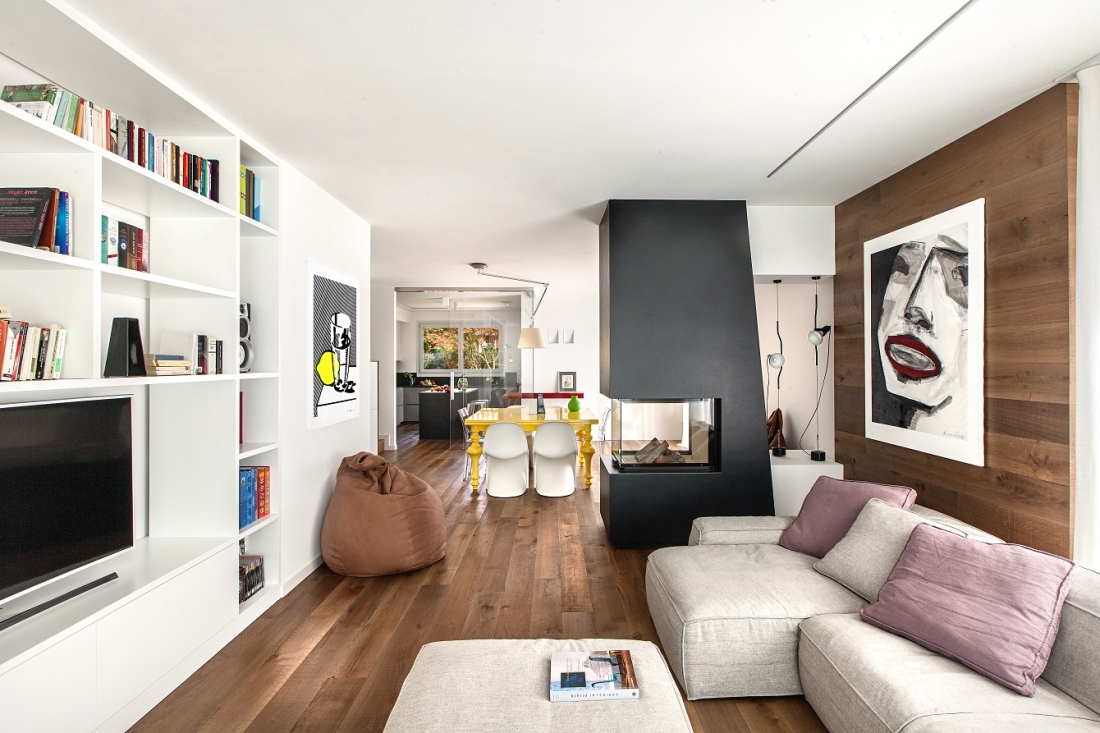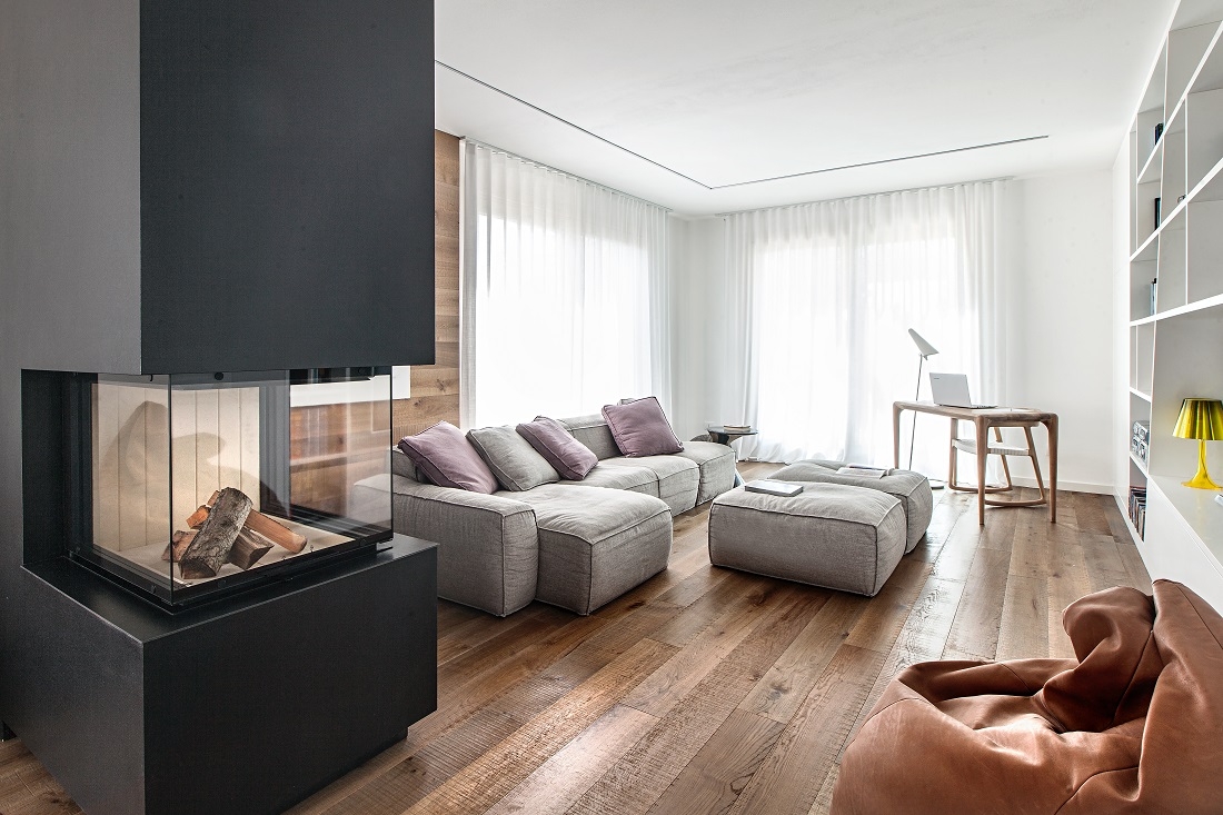In primo piano il camino, sullo sfondo il salotto con il divano Peanut B di Bonaldo.