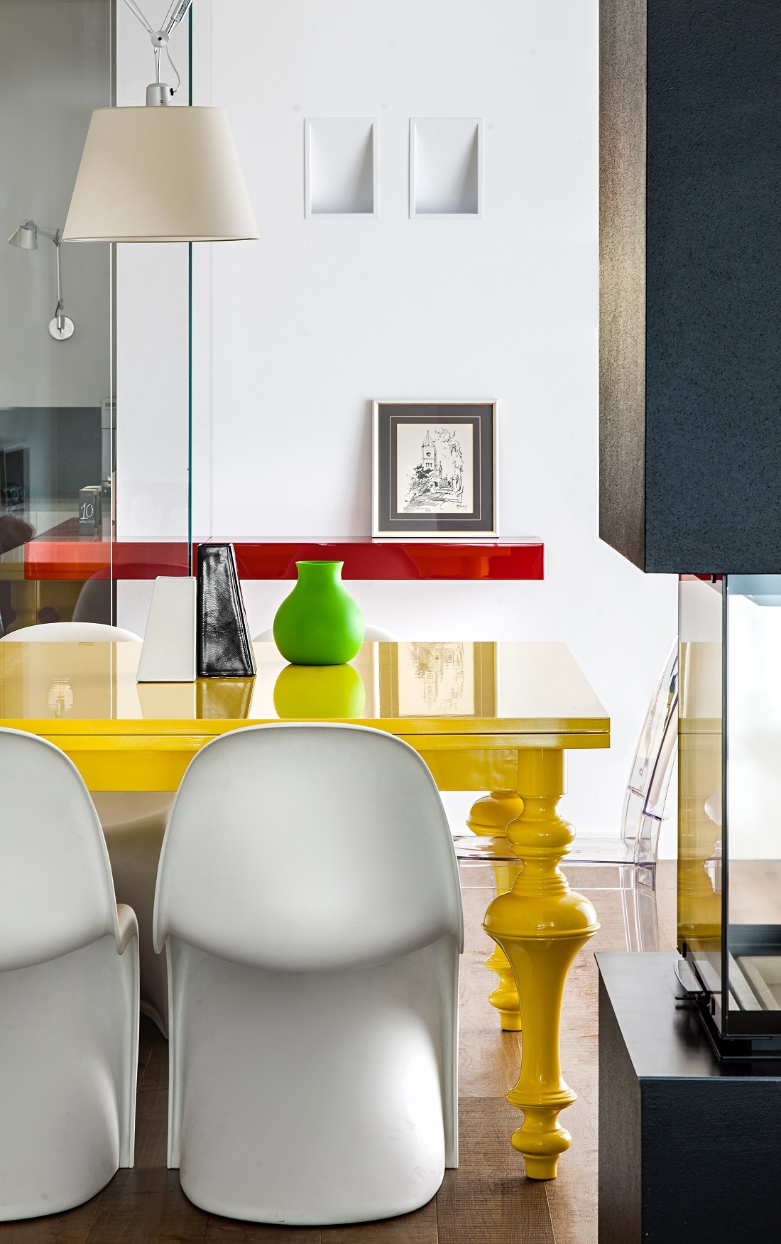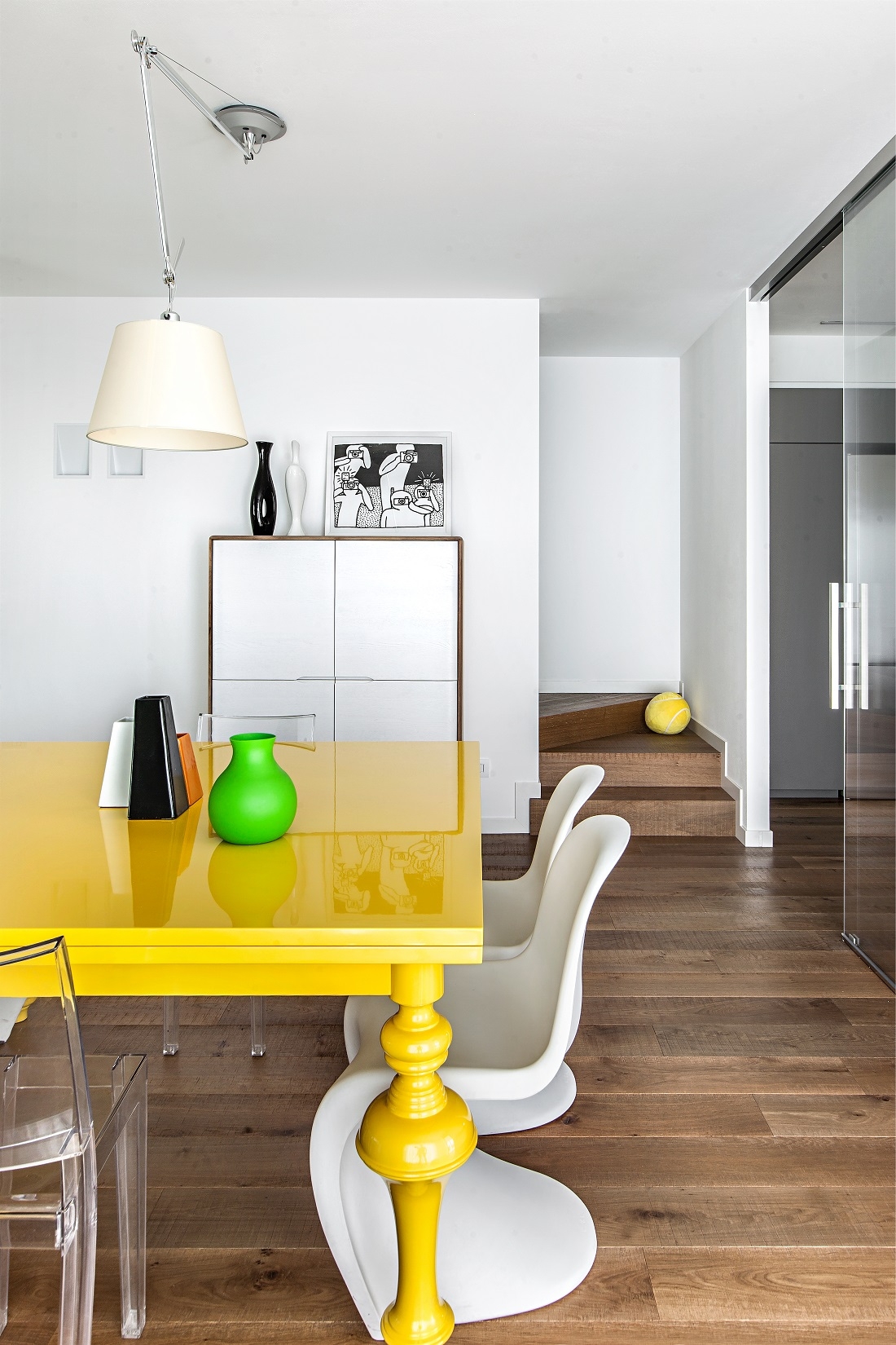 Dettagli del pranzo con le sedie Panton; a soffitto lampada Tolomeo di Artemide.