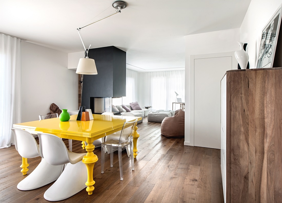 Il tavolo giallo realizzato su disegno abbinato alle Panton Chair di Vitra.