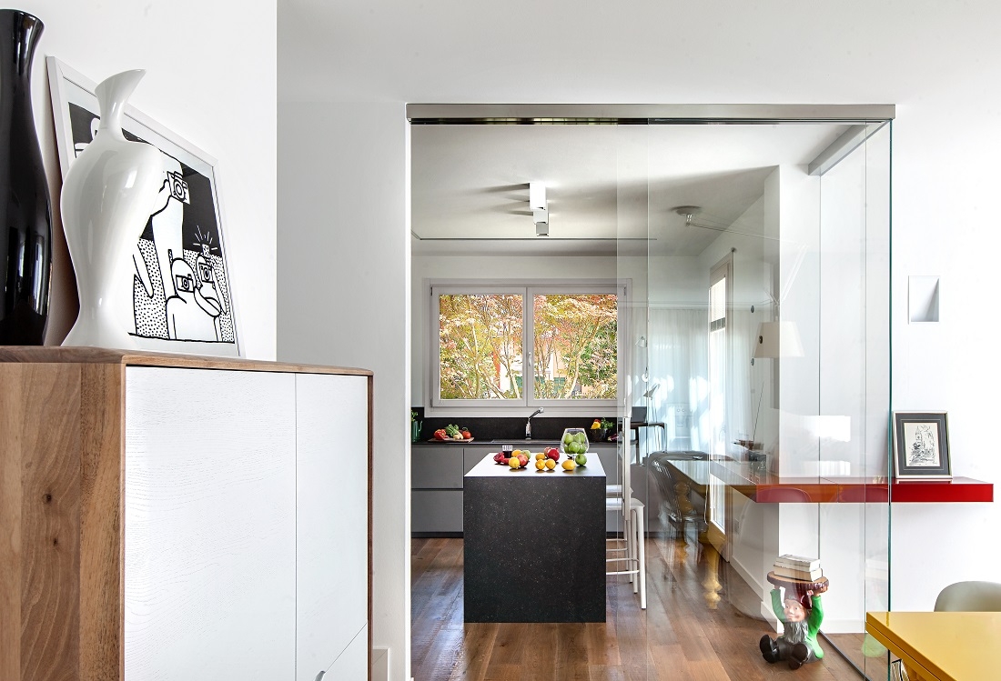 Una parete vetrata separa la cucina dal soggiorno.