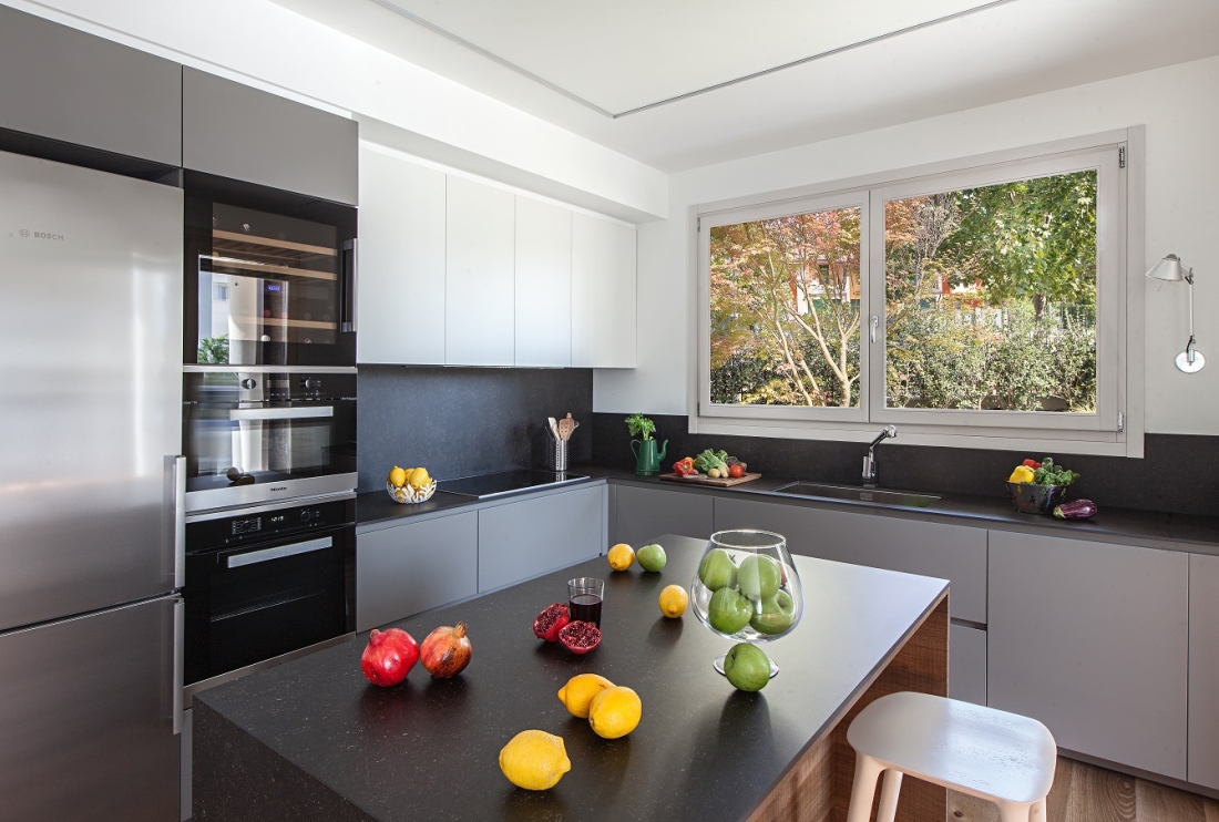 Cucina dai toni scuri di Modulnova; attraverso la grande finestra si può scorgere il giardino.