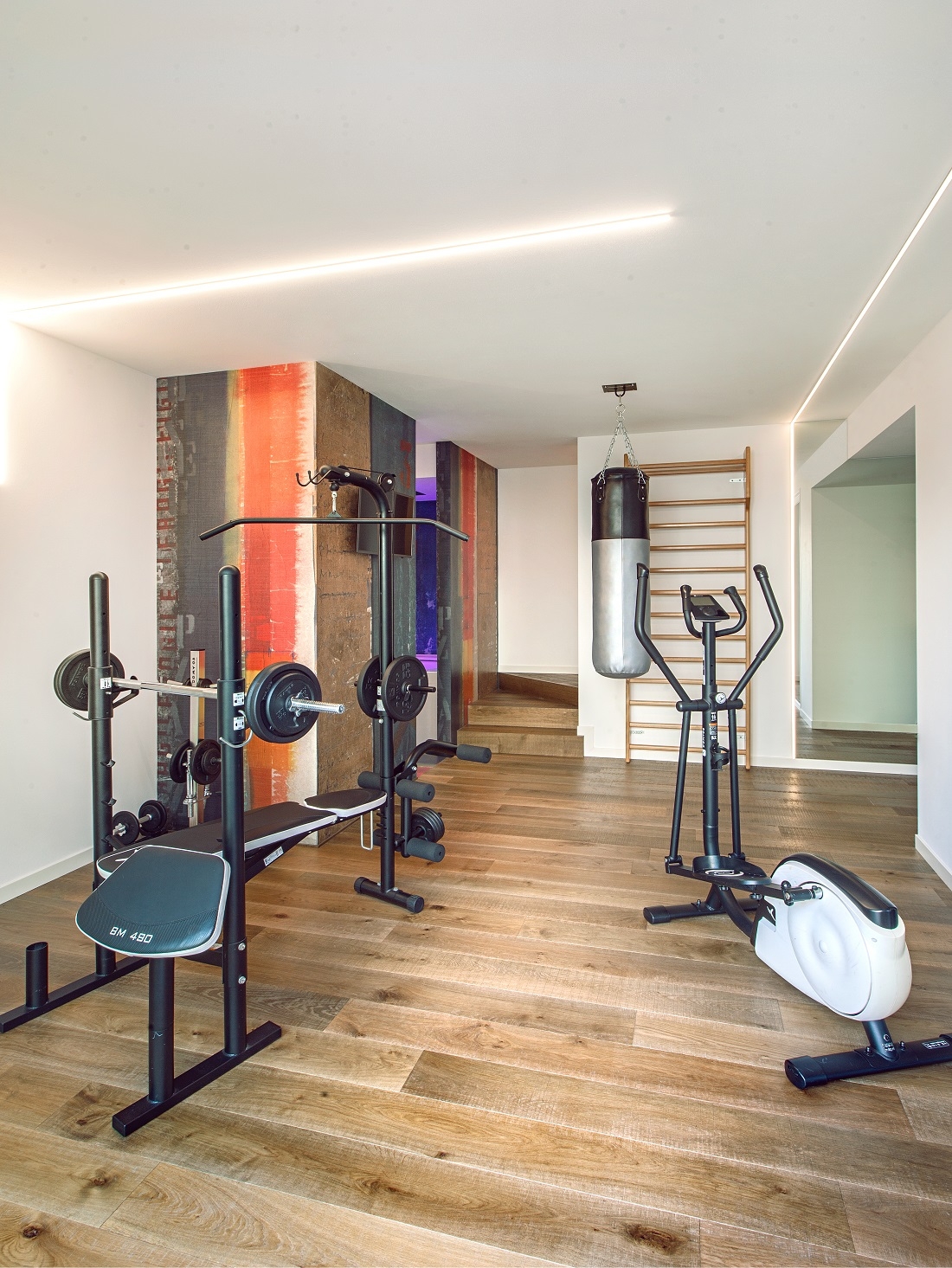 La stanza adibita a palestra; a soffitto profilo “Arcoled” di Viabizzuno.