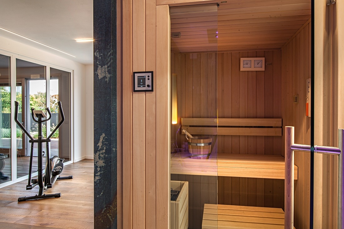 Direttamente collegata alla palestra l’area benessere; in primo piano la sauna.
