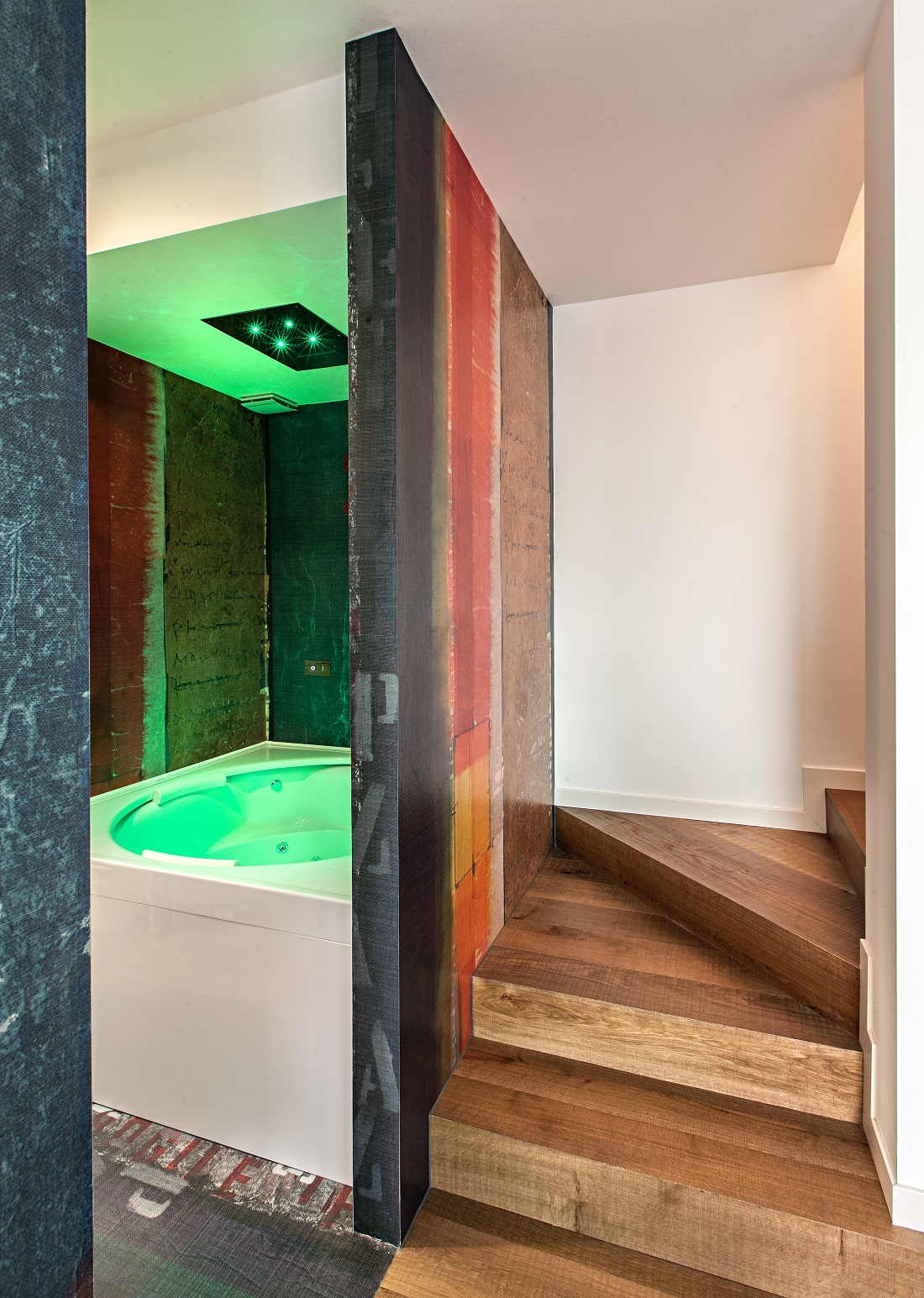Dietro alla parete rivestita con carta da parati di Inkiostro Bianco, la vasca idromassaggio.