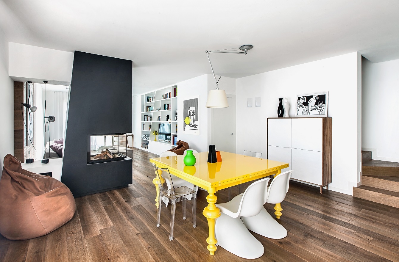 Il fulcro della casa è rappresentato dal camino, che idealmente separa la zona del soggiorno e l’area per il pranzo.
