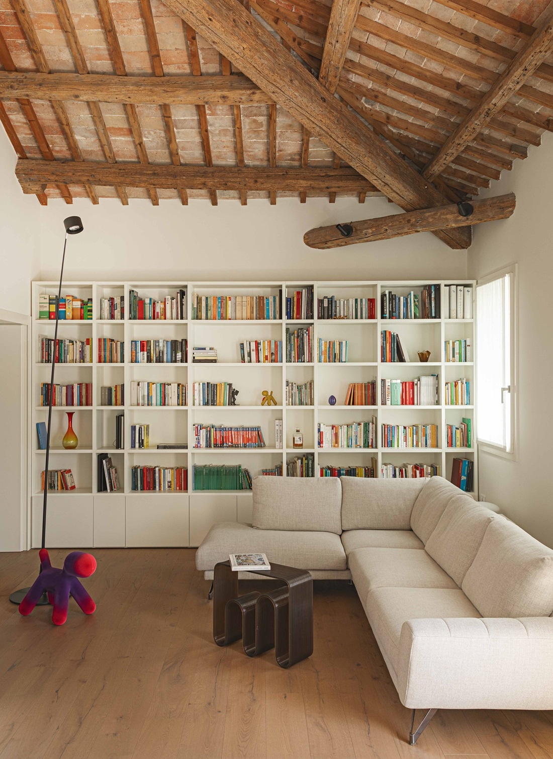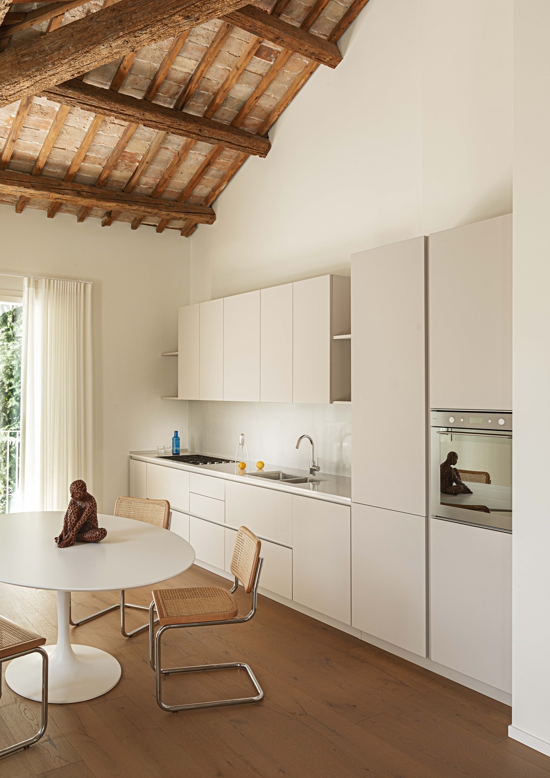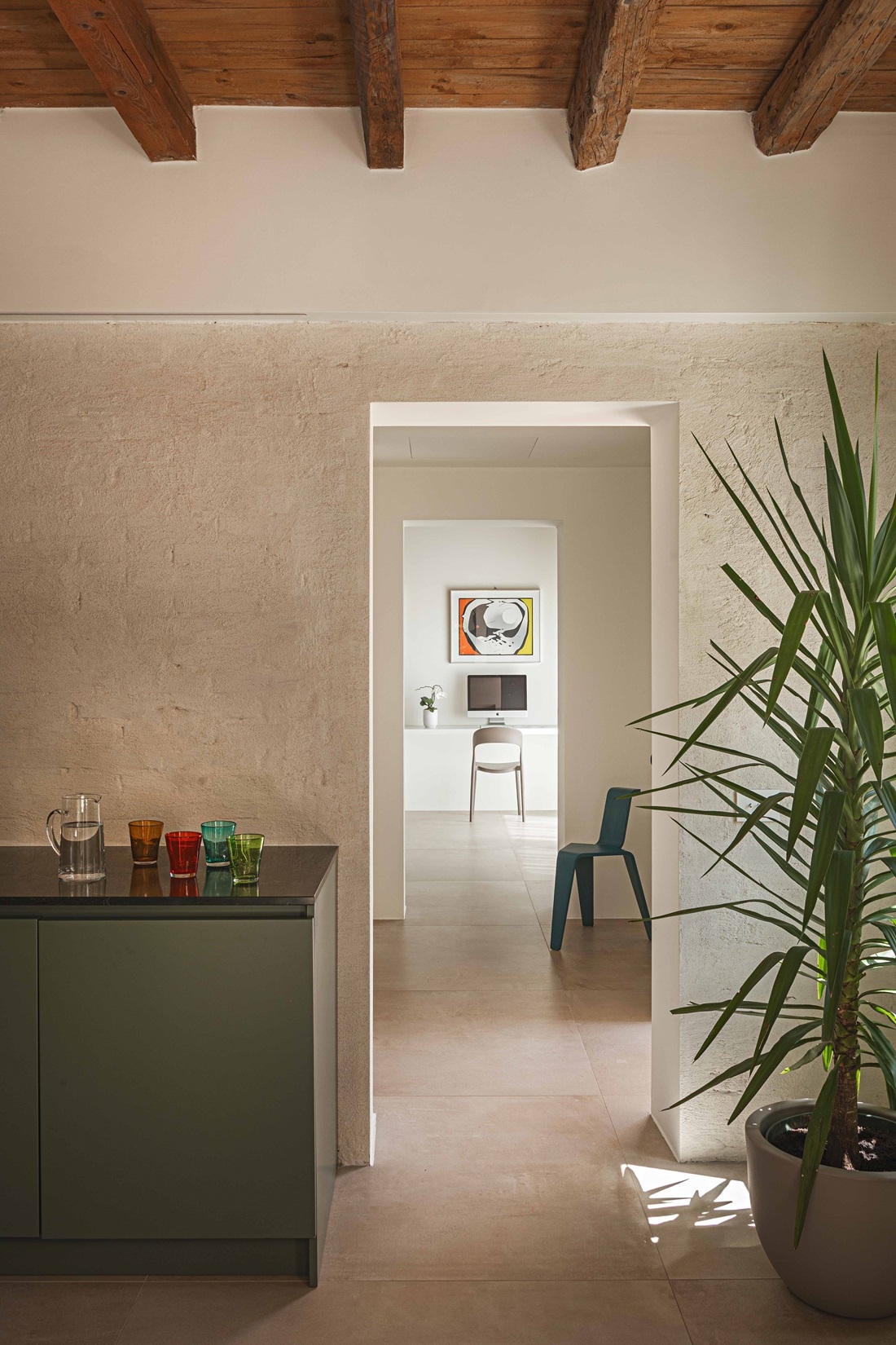 L’intervento ha previsto una ristrutturazione completa, con l’obiettivo di riportare a vista elementi storici come le travi in legno del tetto e le tavelle in cotto, e di creare ambienti interni in stile contemporaneo, capaci di valorizzare l’involucro esistente.