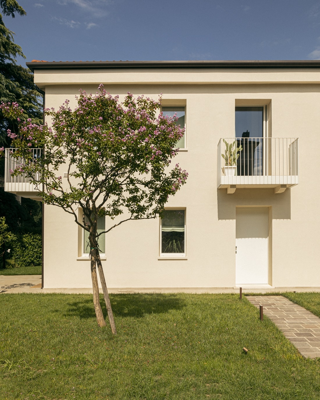 Il prospetto principale visto dall'ampio giardino antistante la casa.