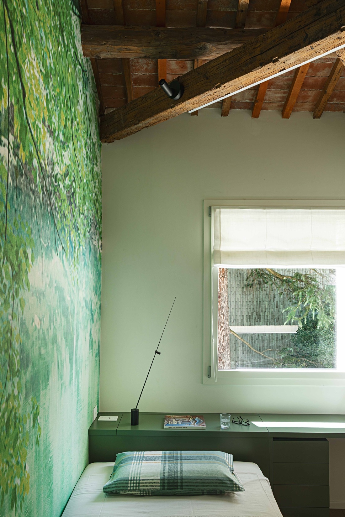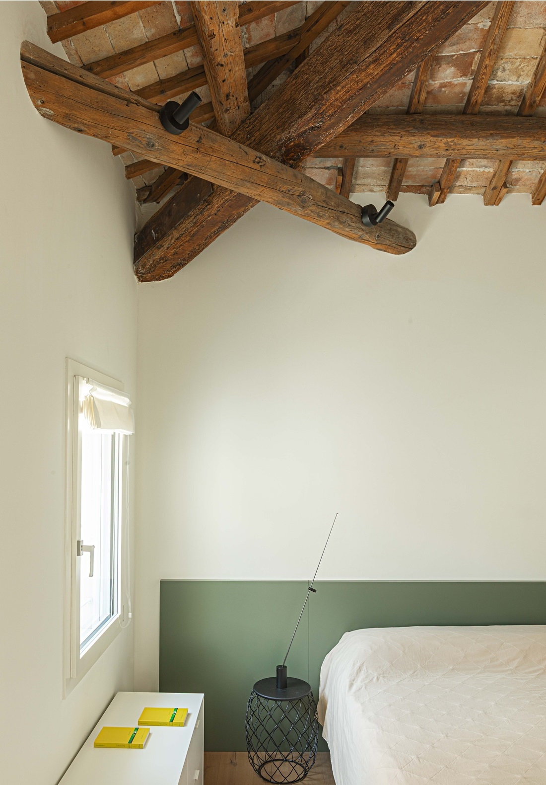 Nella camera padronale, sopra il comodino di Magis, lampada FM di Davide Groppi.