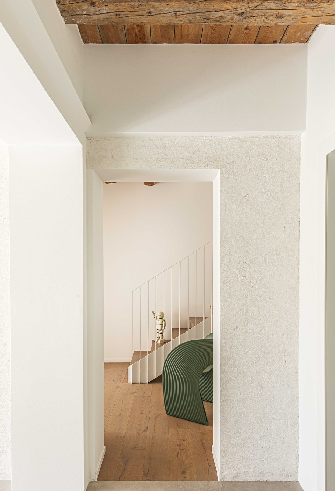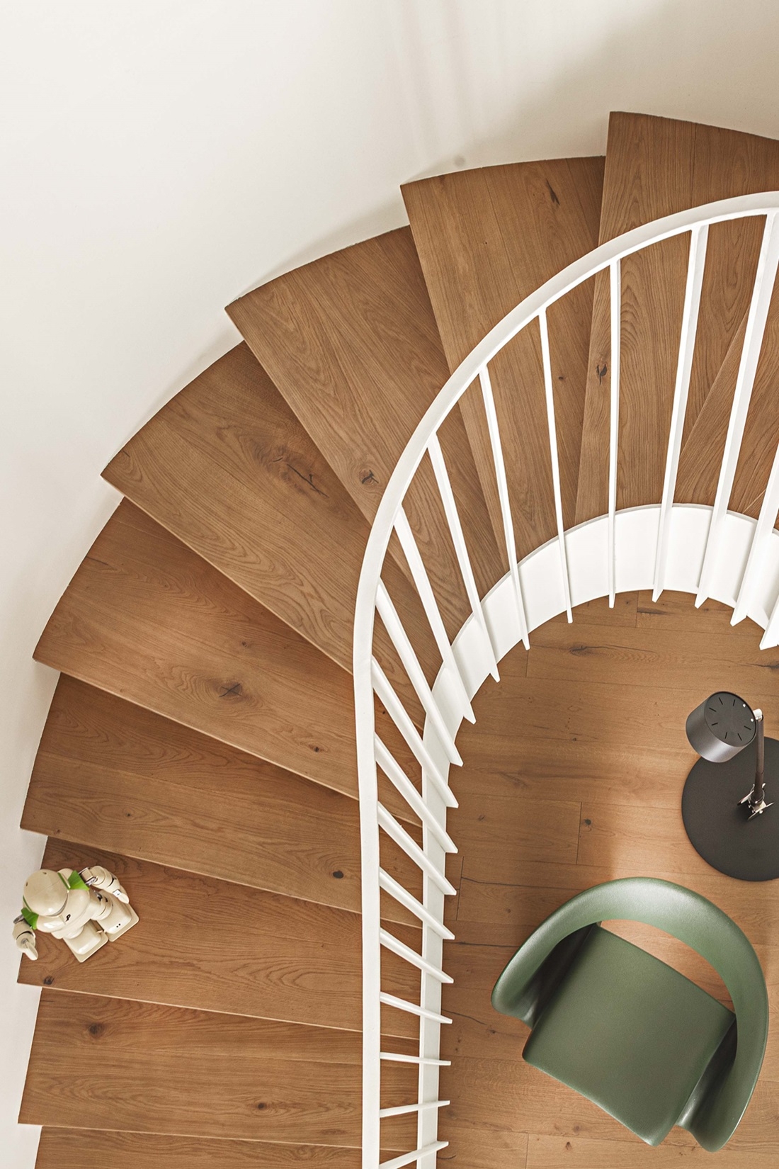 Un elemento protagonista di questa trasformazione è la scala a ventaglio, realizzata in ferro e completamente dipinta di bianco, che diventa il cuore estetico e funzionale della casa, conferendo un tocco di eleganza e leggerezza.