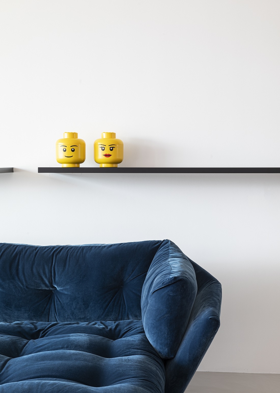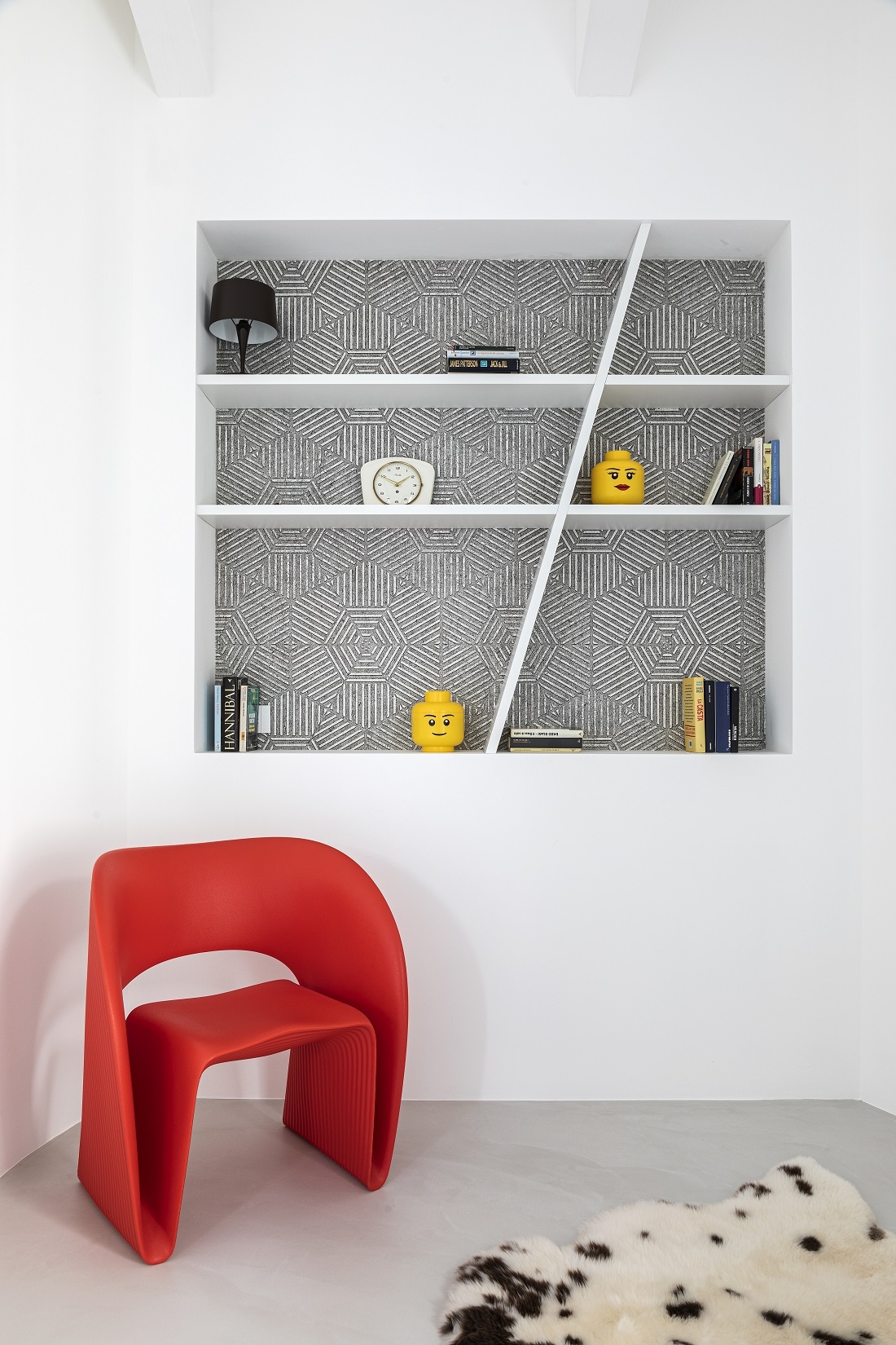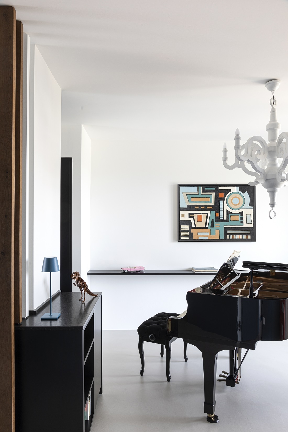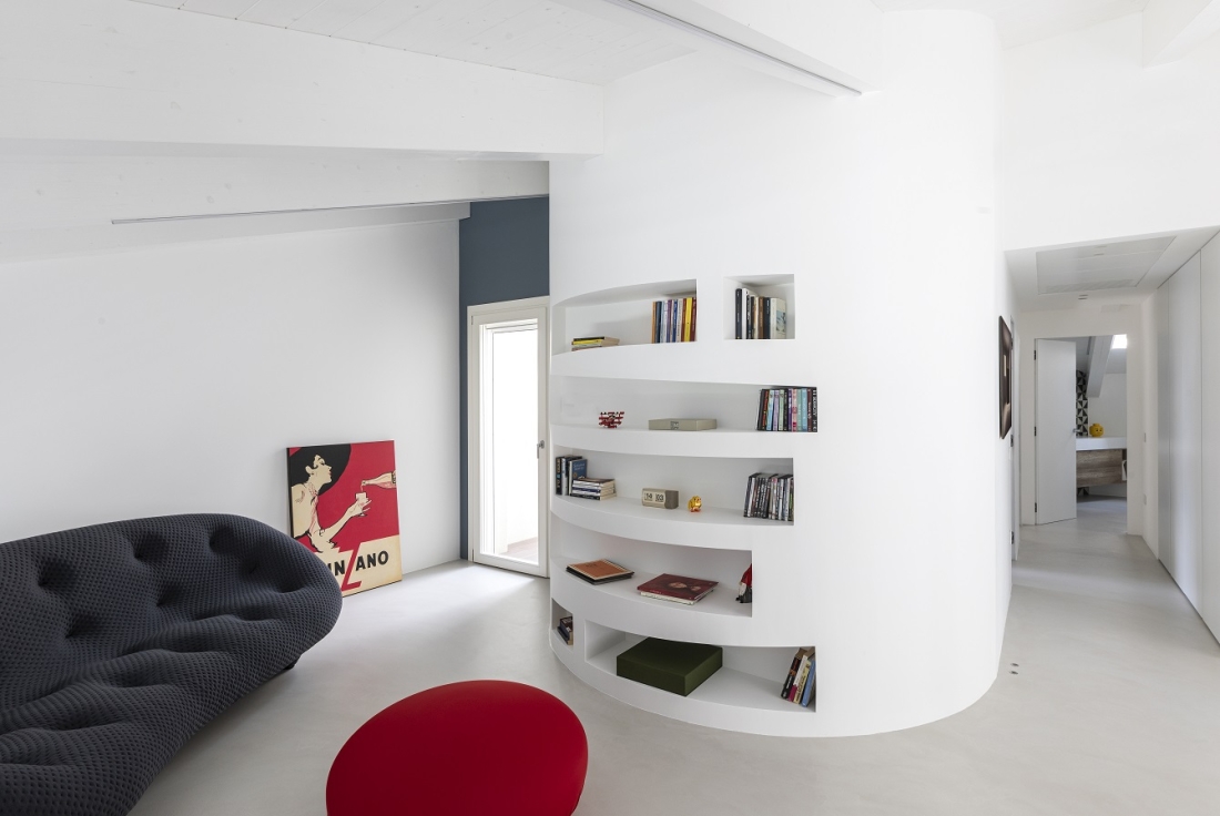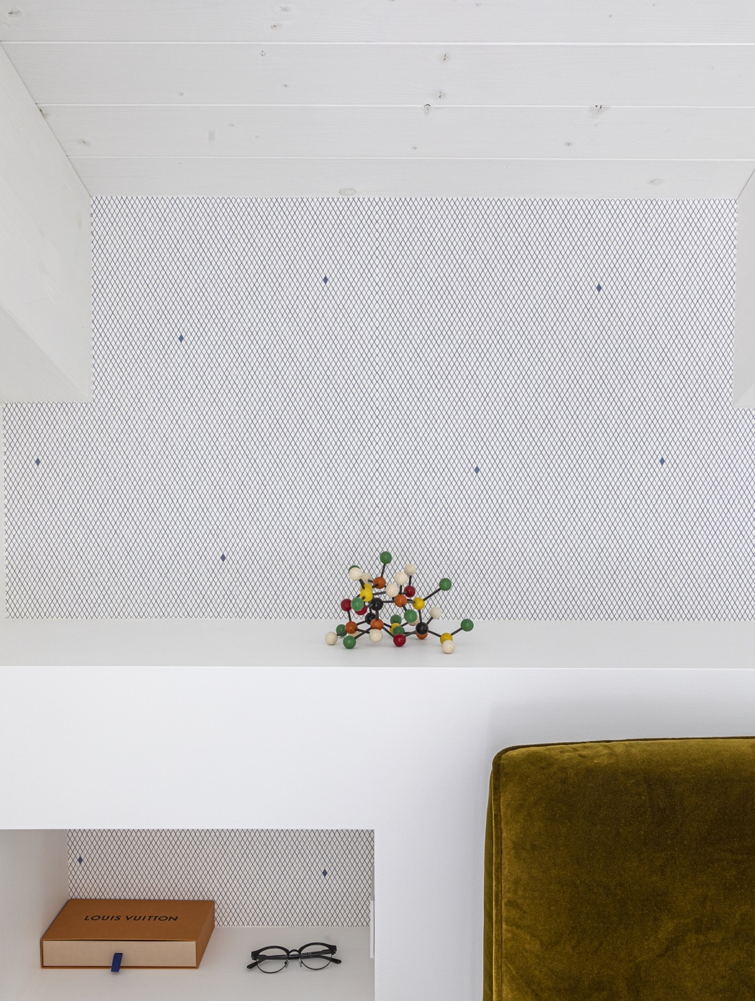 Un’architettura scandita da volumi composti, dal rigore formale di pochi arredi di design, da simmetrie giocate tra nicchie e mensole volubili che regolarmente cambiano i loro “ospiti” ovvero gli oggetti veri protagonisti della casa.