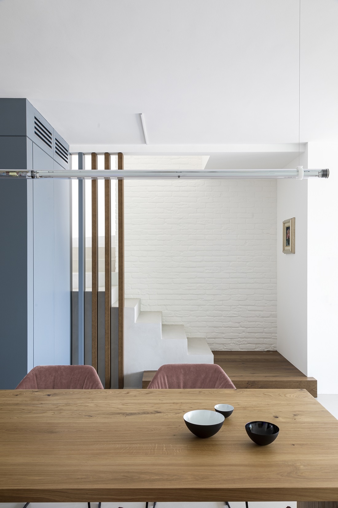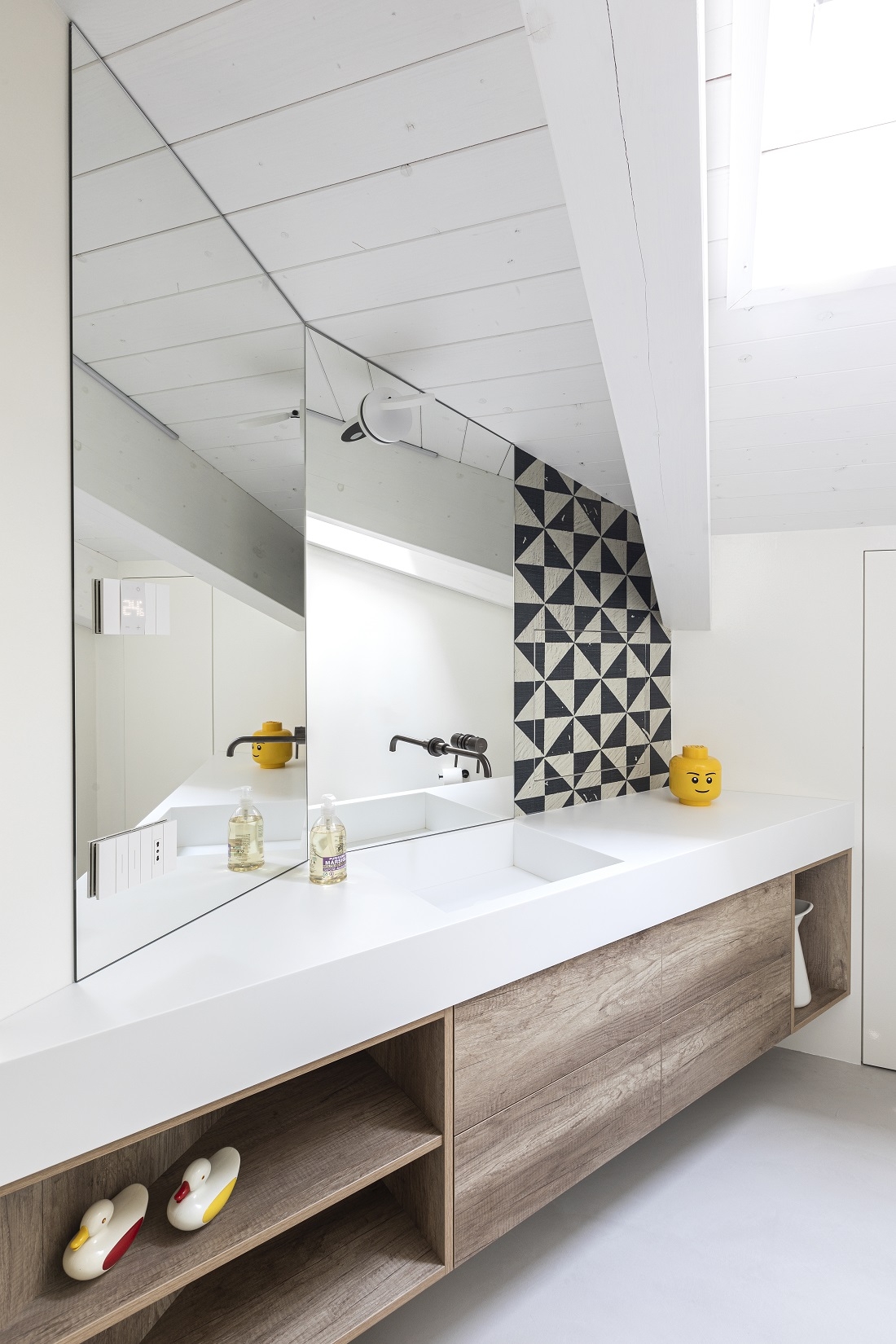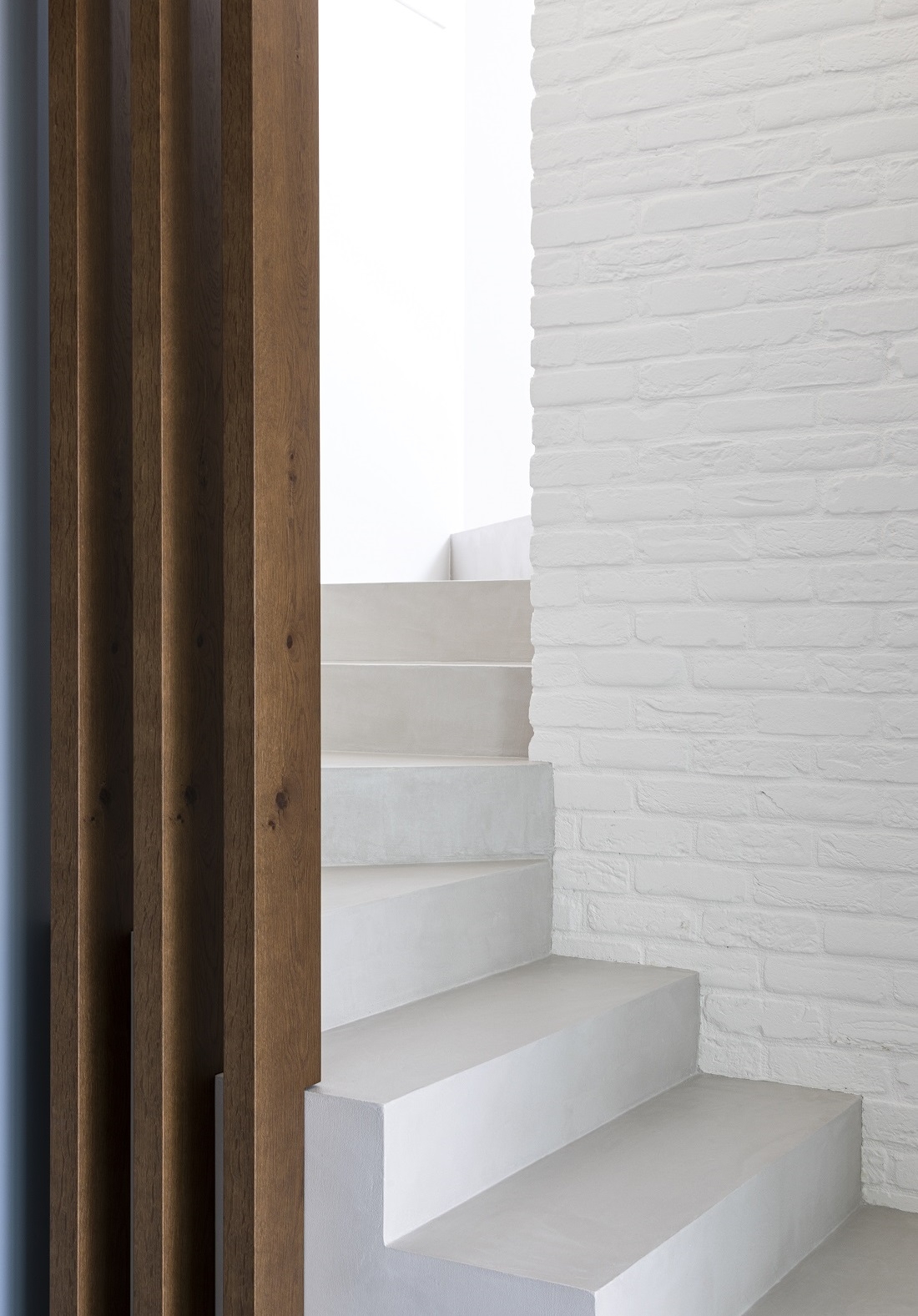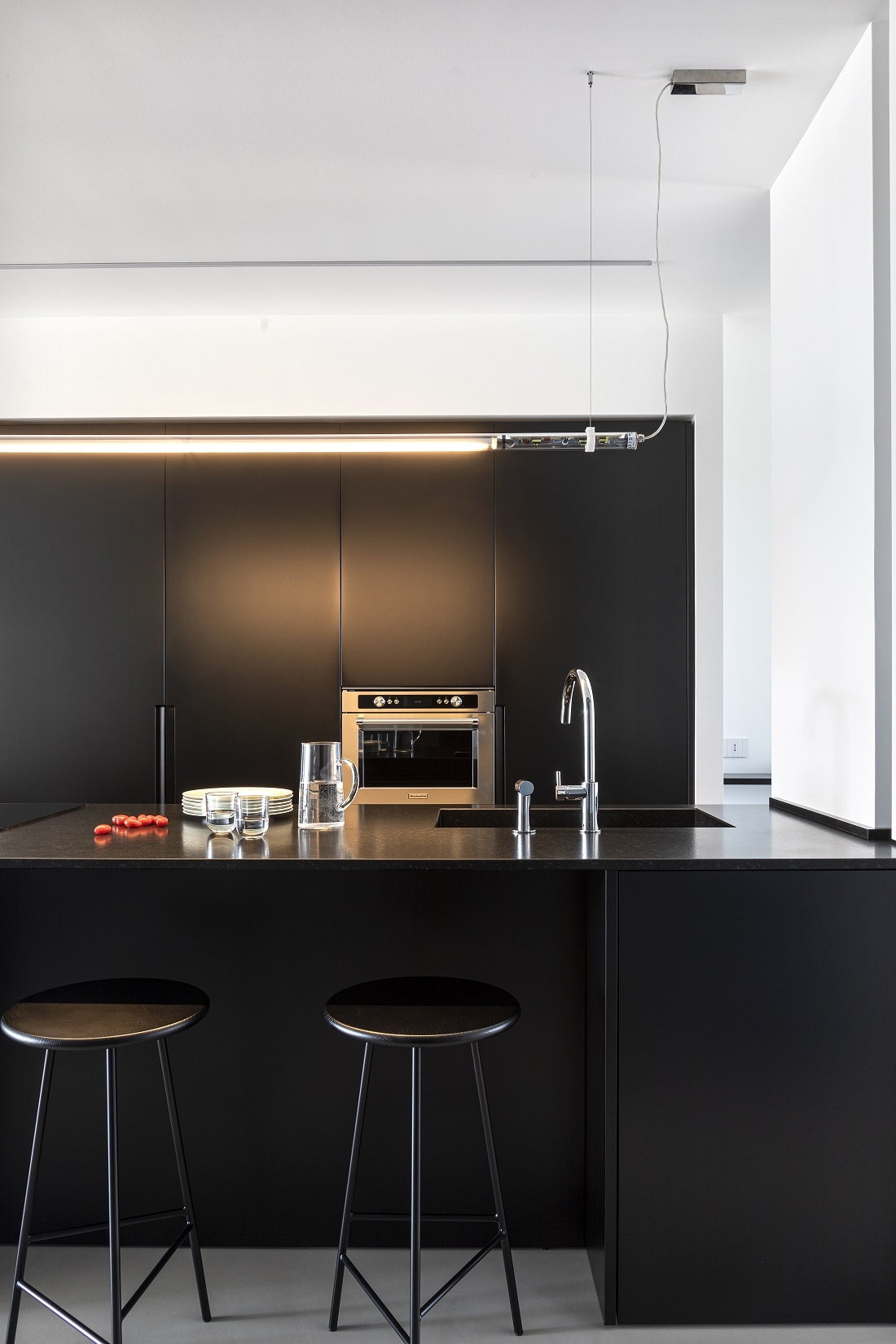 Un’architettura scandita da volumi composti, dal rigore formale di pochi arredi di design, da simmetrie giocate tra nicchie e mensole volubili che regolarmente cambiano i loro “ospiti” ovvero gli oggetti veri protagonisti della casa.