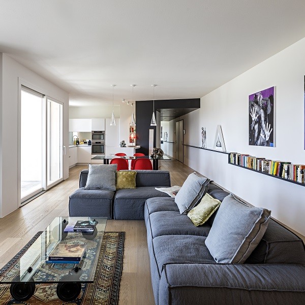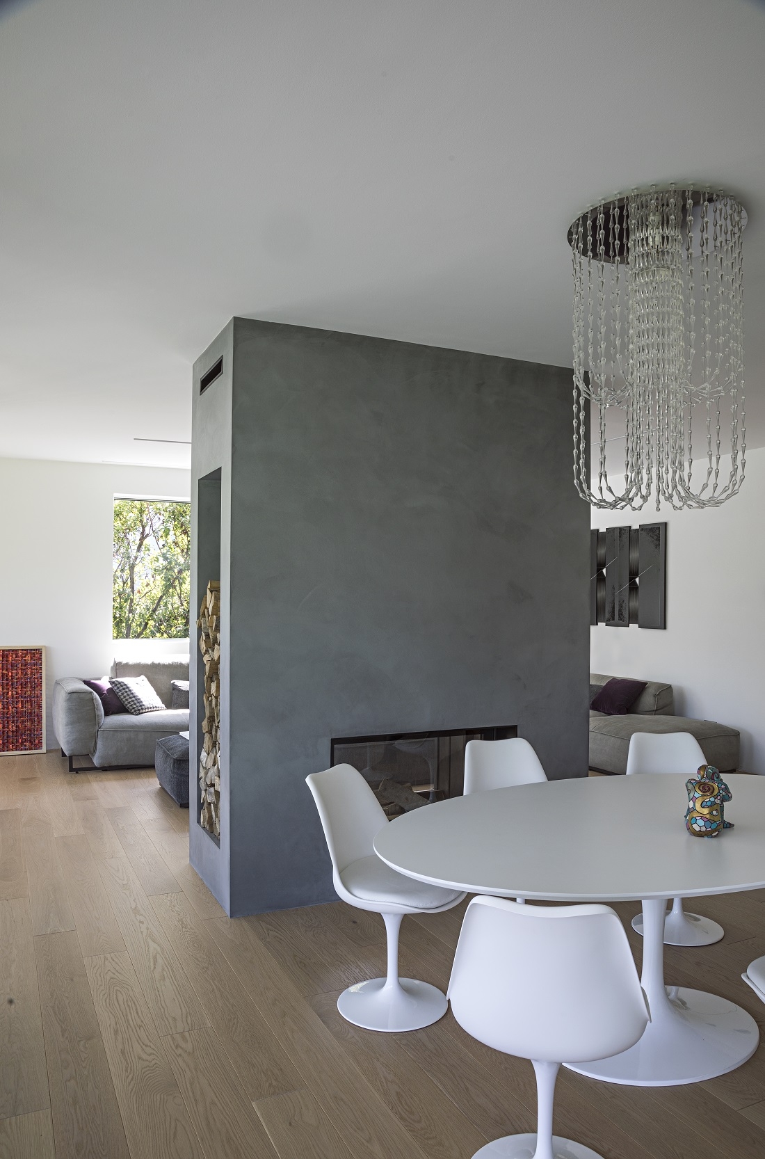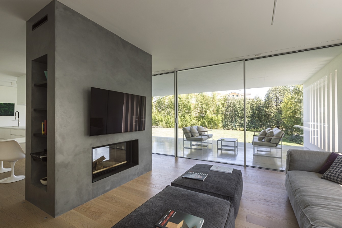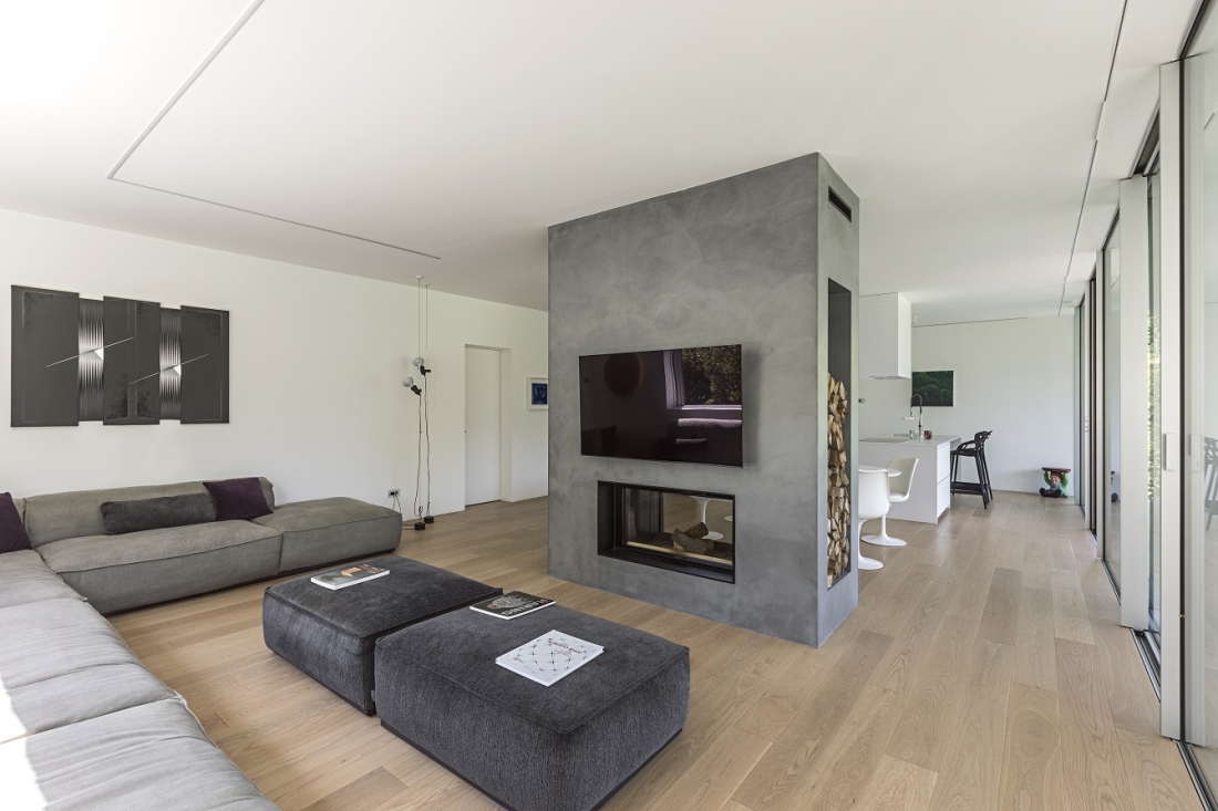 Pavimento in essenza di rovere, il camino Ruegg è rivestito in resina di colore grigio