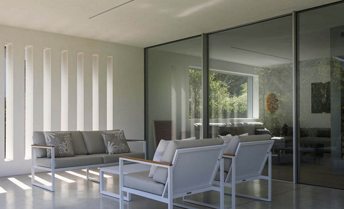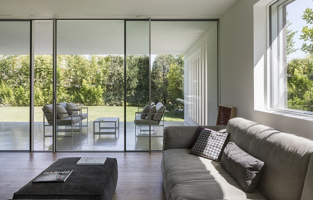 Le grandi vetrate mettono in comunicazione interno ed esterno quasi fosse un tutt'uno.