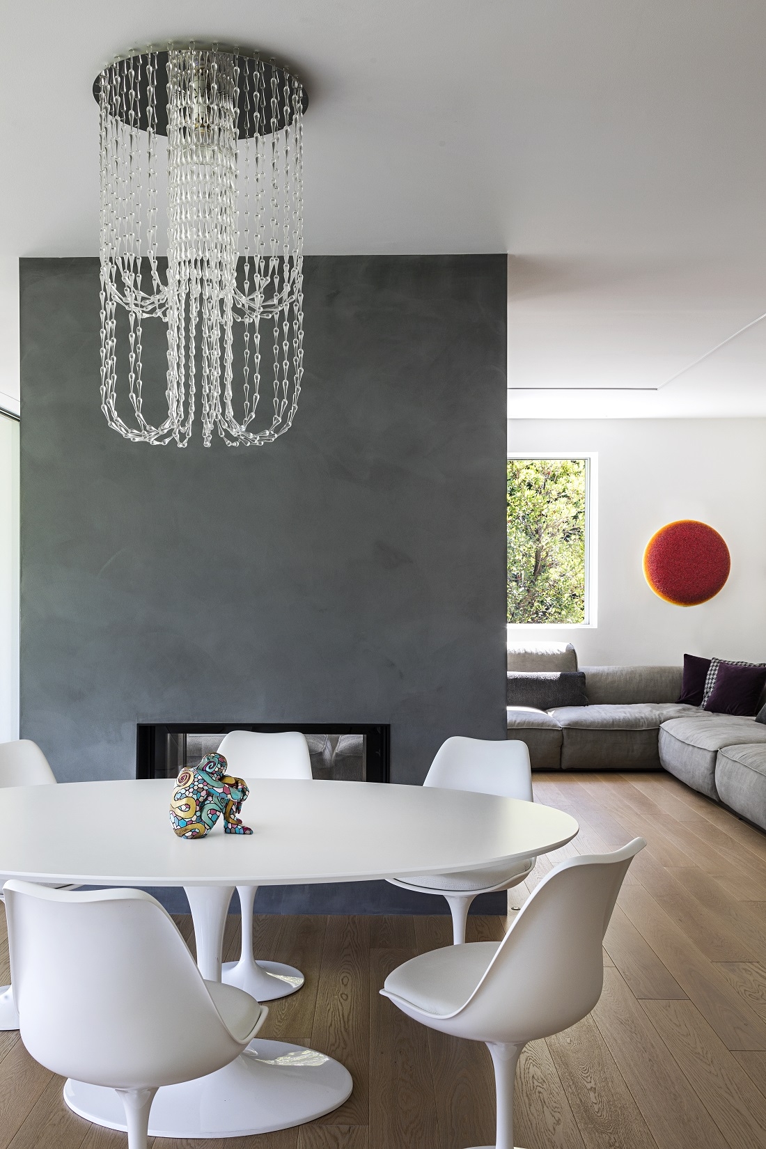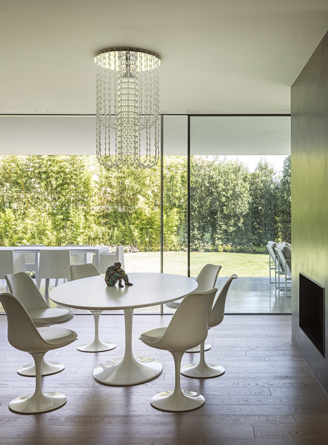 La zona pranzo con tavolo e sedie Tulip; lampadario “Gocce” di Viabizzuno.