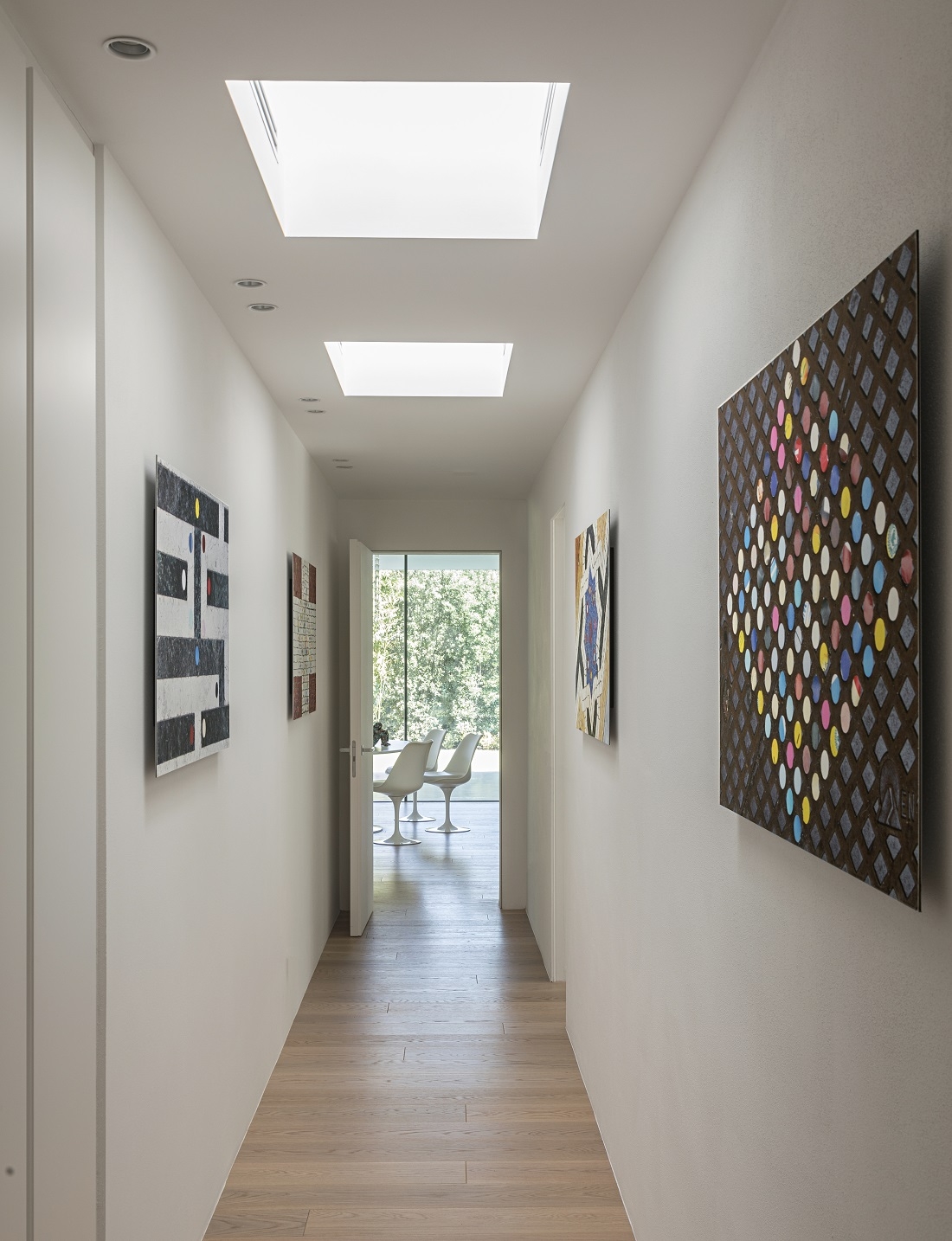 Due lucernari illuminano il corridoio della zona notte. A prete opere di Calixto Ramirez.