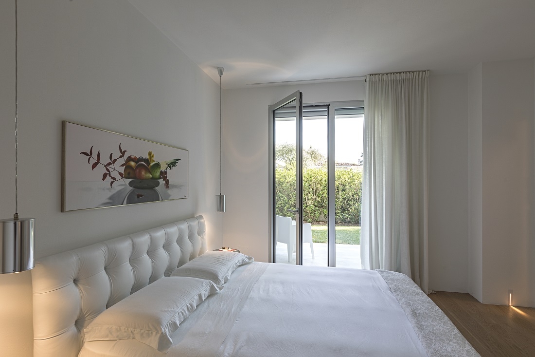 Nella camera da letto padronale, a terra segnapasso “raggio” di Viabizzuno.