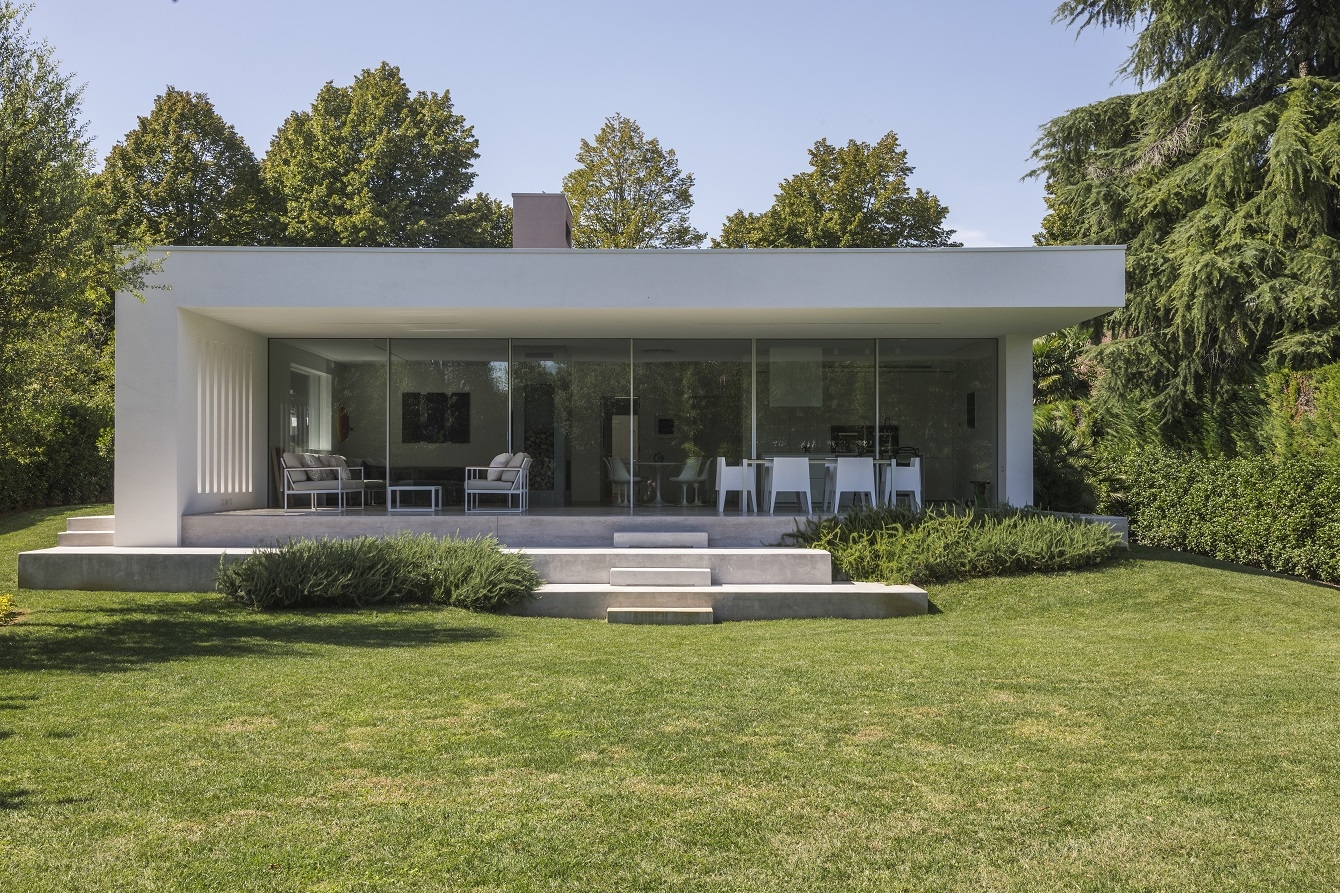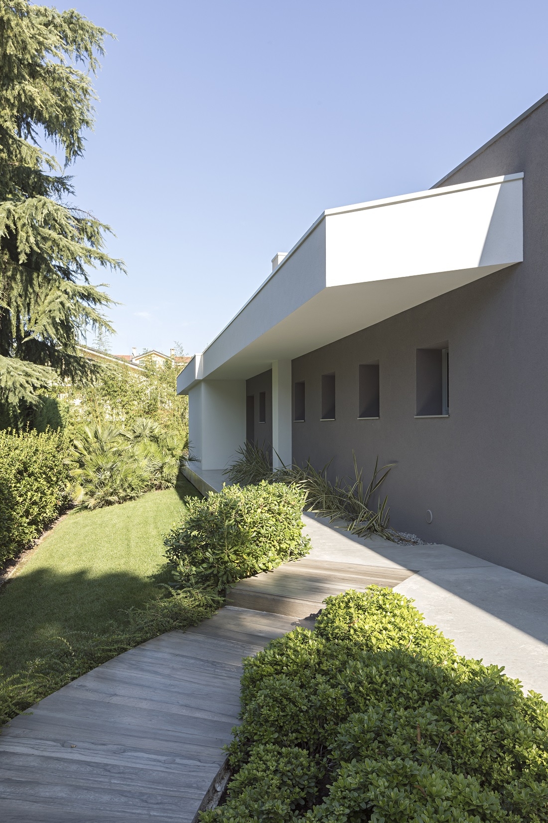 L’idea progettuale ha previsto di creare una villa sviluppata su di un unico piano, “chiusa” sul lato strada e “aperta” verso il giardino retrostante, più intimo e raccolto.