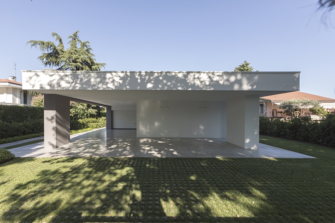 Sul fronte strada, il patio costituisce un comodo ricovero per le automobili.
